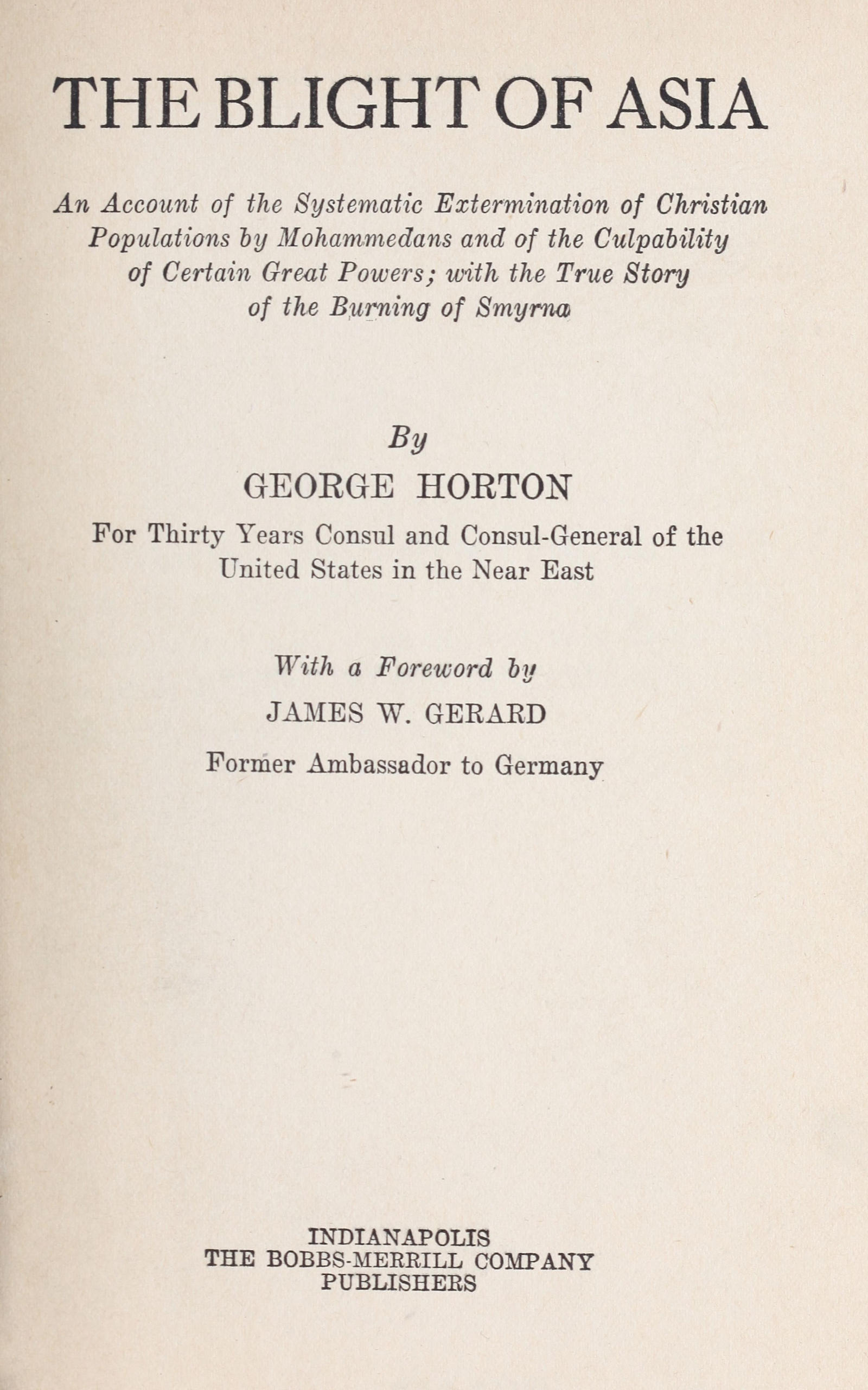 I was in Smyrna in May of 1917, when Turkey severed relations with the United States, and I received the oral and written statements of native-born American eye-witnesses of the vast and incredibly horrible Armenian massacres of 1915-16—some of which will be here given for the first time; I personally observed and otherwise confirmed the outrageous treatment of the Christian population of the Smyrna vilayet, both during the Great War, and before its outbreak. I returned to Smyrna later and was there up until the evening of September 13, 1922, on which date the city was set on fire by the army of Mustapha Khemal, and a large part of its population done to death, and I witnessed the development of that Dantesque tragedy, which possesses few, if any parallels in the history of the world.