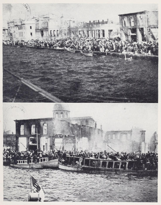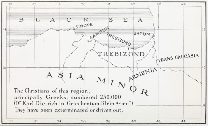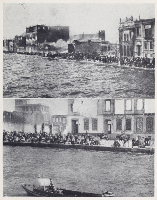 1. Smyrna was burned by the Turks, as the concluding, at present, act in a consistent policy that has been shaping Moslem history and expansion for centuries, and especially Turkish history since the coming to power of the Young Turks, as displayed in the “Turkifying” murders, tortures and persecutions in Macedonia that led to the First Balkan War (1912); the killing and driving from their homes of the Greeks of Asia Minor during the period just preceding the outbreak of the World War and the destruction of their flourishing villages, (as described by the Frenchman Manciet, writing of the scenes at Phocæa); the deportation of Greeks, men, women and children in the midwinter of 1916, from the Black Sea region, forcing them to walk in the inclement weather till many thousands perished (as mentioned by Dana K. Getchell, in his letter given above); the doing to death of between eight hundred thousand and a million Armenians in 1915-16; the [282]burning of Smyrna and the massacre of thousands of its inhabitants in 1922.