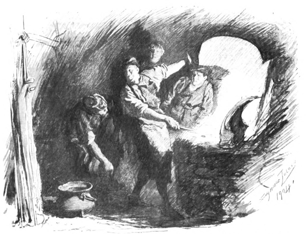 And forthwith he took me to the farther end of the forge, where on a shelf stood a row of dark pails of a square shape, full of a dark liquid that looked like oil.