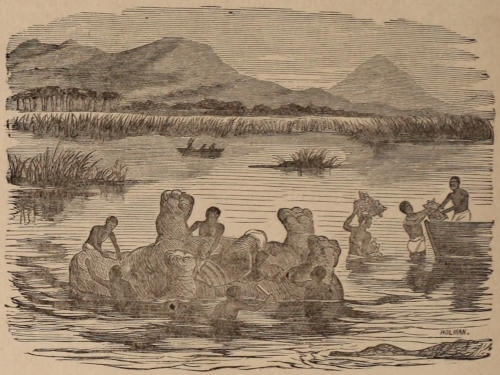 [13] The Anyasa name for a hippopotamus is mvu, the Yao name is ndomondo. The first word is undoubtedly taken from the snorting of the animal, while the second word may be taken from the splash with which the animal returns to the river after feeding on the bank.