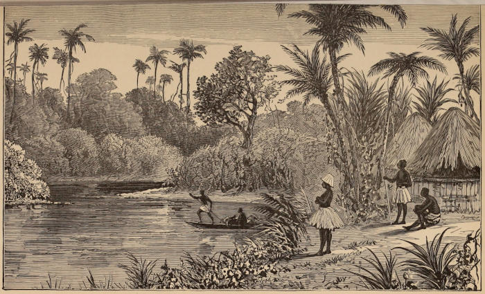 [41] In this way it is usual for villagers on the river banks to challenge canoes. It would be very unusual for the crews to pass on without heeding the call, for then the villagers might fire on them. It is no excuse to speak of “being in a hurry” in this land. The same rule applies in the case of strangers passing a village. Europeans, however, are understood to be always in great haste, and are seldom interrupted.