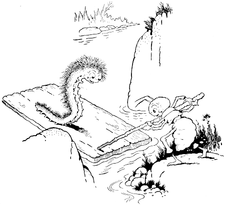 Good luck followed Anthony Ant all the remainder of the way home. It even seemed not to be following him, but waiting for him ahead at every turn. His feet did not get blistered and sore. His lunch basket once more had been slyly filled at the Wild-Rose Tea House, but this time by the good-natured keeper himself, who packed it with enough nourishing things to last the Ant for the final part of the journey. A good floating bit of stick was already waiting for him at the edge of the brook, and soon floated gently to a small stone, and from that to a branch that hung out from the home side of the shore. Then he had no trouble finding the old trail to Ant-Hill Manor, and when he[Pg 238] passed the Angleworm’s doorway he saw no sign of her.