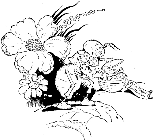 He washed himself and put on his best clothes. When he was ready, she gave him his little case, his lunch basket, and his hat and kissed him good-by. He thought she did not seem very sorry[Pg 11] about his going, and that was queer, for never before had he been away from her overnight. He did not say anything, though, but put on his nice straw hat[Pg 12] with his initials inside—A. A. for Anthony Ant—and down the steps of Ant-Hill Manor he went while all the other Ants waved their feelers at him. Not one of them cried a tear. He even imagined his mother was smiling as though it were all a joke.