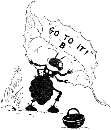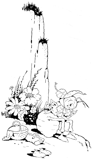 It was a hot morning and the sun beat down on the Ant’s bare head, so he picked a soft, green leaf, put it on his head, and tied it under his chin with a narrow grass blade. That was much better, and he almost sang one of the nursery rimes he had heard played on his phonograph at home. If his feet had not been so large for his shoes, he was sure he would have sung it, words and all.