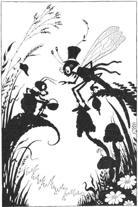 The Ant looked, and there sat a Beetle on the same leaf. He had on large, horn-rimmed spectacles, and was writing busily on a physician’s prescription pad. Any one could see he was a doctor. He handed the prescription to the Ant, took off the big spectacles, and said, “Now run along to your mother, and show her this at once.”