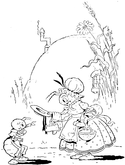 Off went the Ant to do as he was told. When he came back, there stood his mother with his best hat in one of her hands, his Sunday suit in another of them, his toothbrush, comb, wash cloth, and soap in a little case in another hand, his best Sunday shoes and stockings in another, and a basket of lunch in another.
