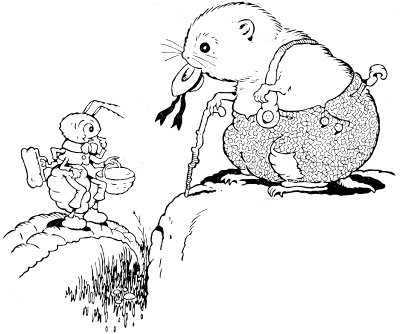 Oh, my, but the Ant was scared! She had thought him an agent of some kind when she saw the basket in his middle right hand. He opened his mouth to try to explain the whole matter to her, but she would not let him speak.