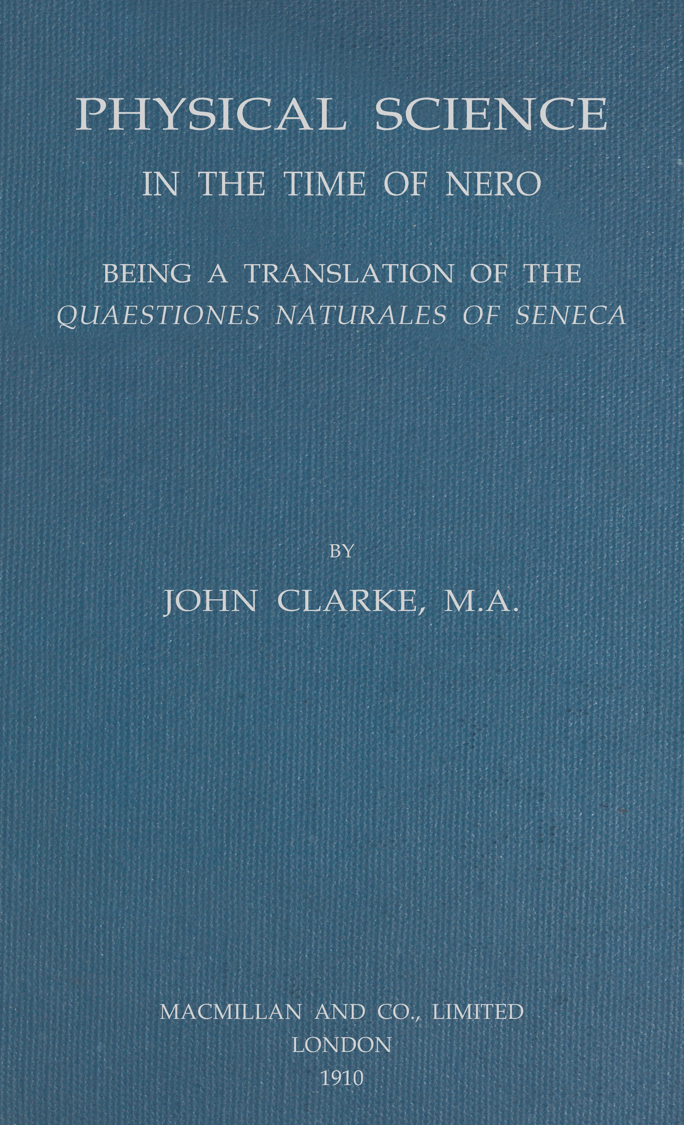 This book is intended primarily for English readers, to most of whom it will probably be at least new. Thomas Lodge, the well-known dramatist, published in 1614 a translation of the whole of Seneca’s prose works (except the Apocolocyntosis), but no English editor or commentator seems to have turned his attention to the Quaestiones Naturales, either before or since. Lodge’s translation, a folio volume of nearly a thousand pages, was probably very good for its day, but is now out of date.
