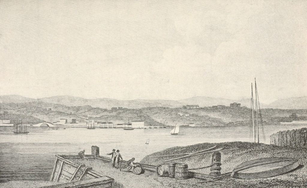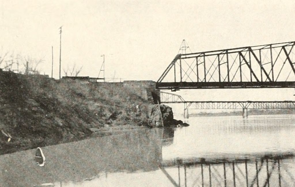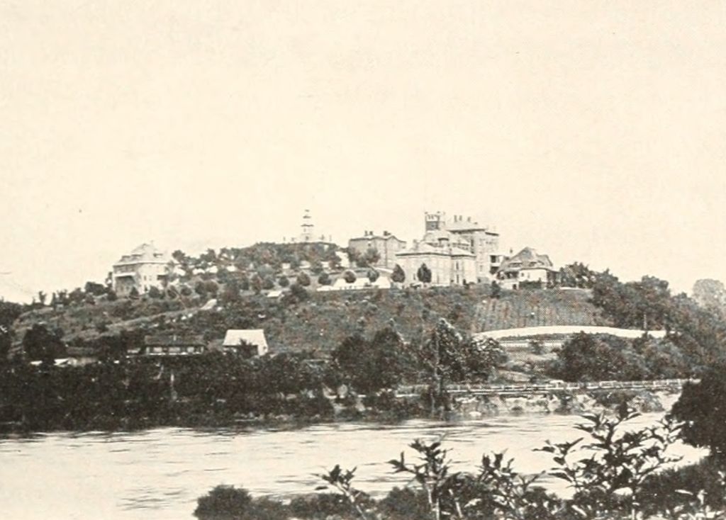 This promontory is now used as the abutment of one of the three bridges that span the river, and its beauty has been destroyed; but [Pg 539]in the old days, when it was clothed with trees and ferns clinging to its rocky sides and reflected in the waters below, it was a charming sight, and must have been hailed with joy by the early travelers after their weary journey from the distant sea through the monotony of the low-lying wilderness.