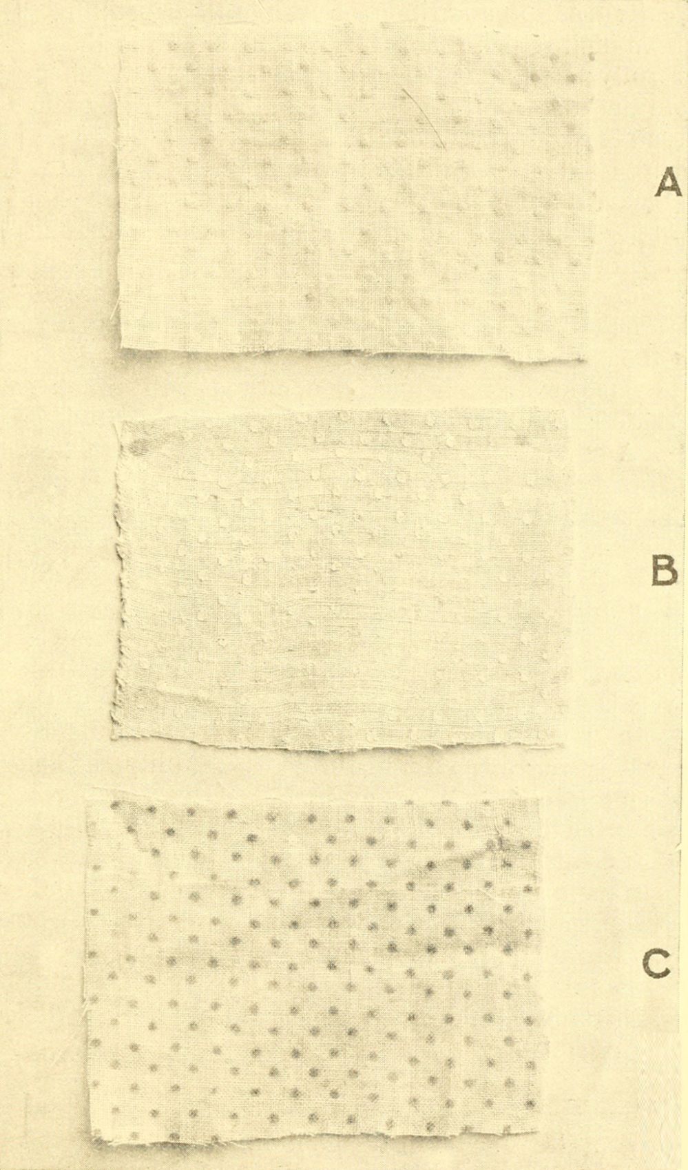 Another method of adulterating cotton is shown in certain kinds of dotted swiss. A good swiss has thread dots woven or embroidered in the cloth. Fig. 1A shows a piece of material sold at the price of a good swiss, but in this case the dots are merely a heavy paste, printed on the cloth. Fig. 1B shows the result of continued washing, where the dots have disappeared, and Fig. 1C, the result of ironing with a hot iron, which turned the spots brown before the cloth itself is harmed.