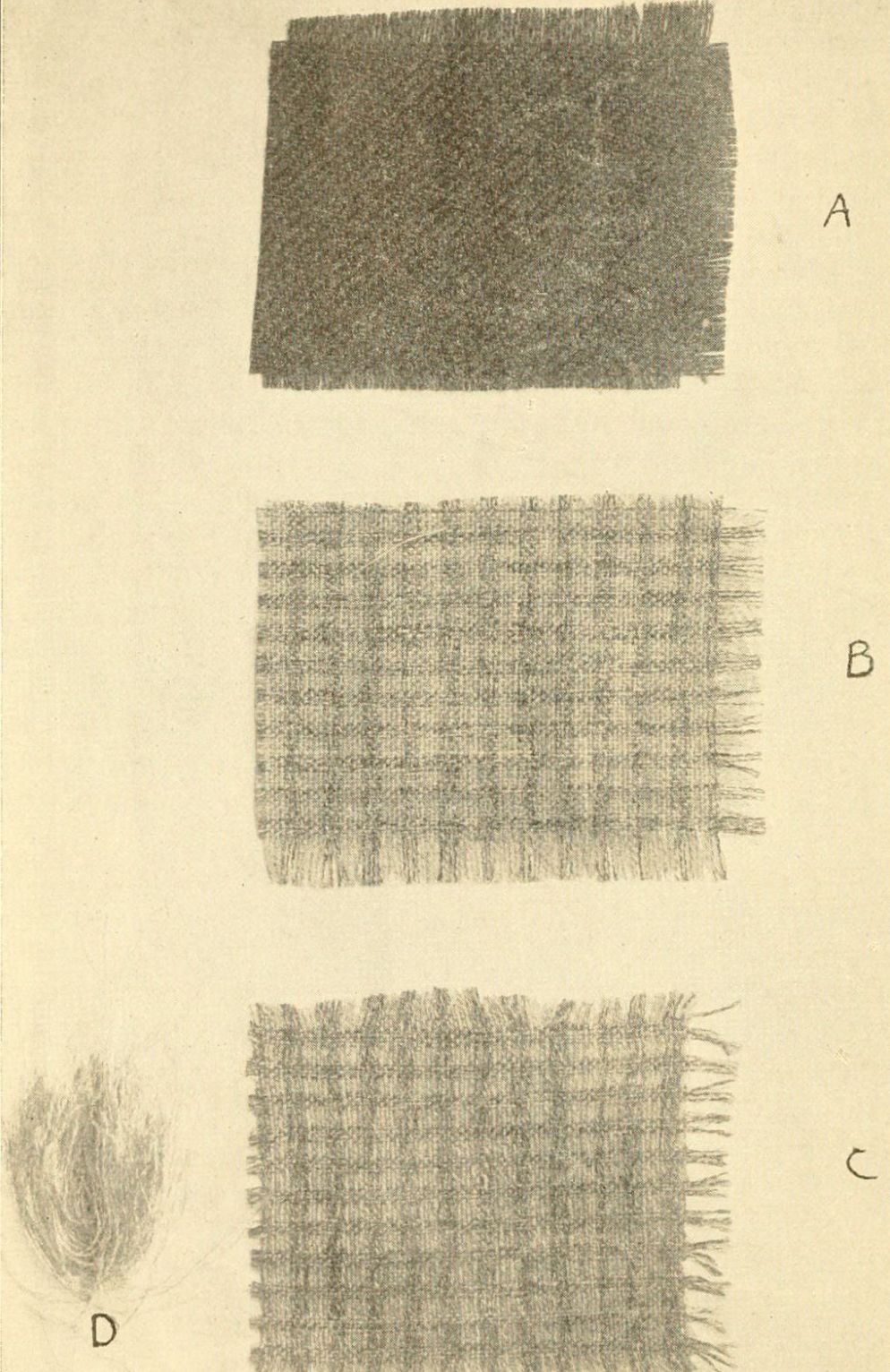 Fig. 2A shows a sample of all-wool cloth, of the class of worsteds which cost seventy-five cents a yard. Fig. 2B shows a sample of cloth of the same price, called by the clerk, all-wool, but which on examination was found to have only four threads of wool to every twelve threads of cotton. Fig. 2C shows this same cloth with the wool removed by strong alkali, caustic potash, leaving the cotton. Fig. 2D shows the wool left when the cotton has been ravelled out, or has been removed by a strong acid solution.