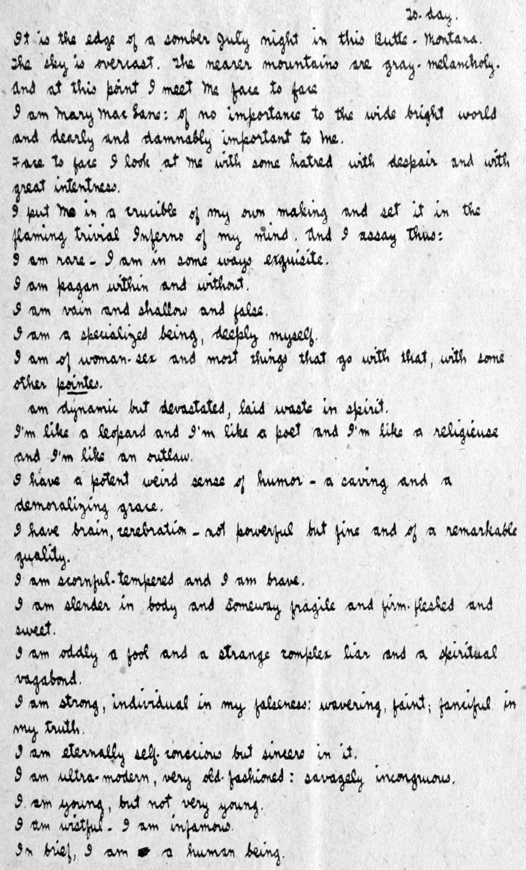 It seems to me that Mary MacLane’s Diary of Human Days is the best answer in the world to all those people who hold that to express yourself completely and sincerely is to have to created Art. Mary MacLane says: “So I write this book of Me—my Soul, my Heart, my sentient Body, my magic Mind: their potentialities and contradictions.”