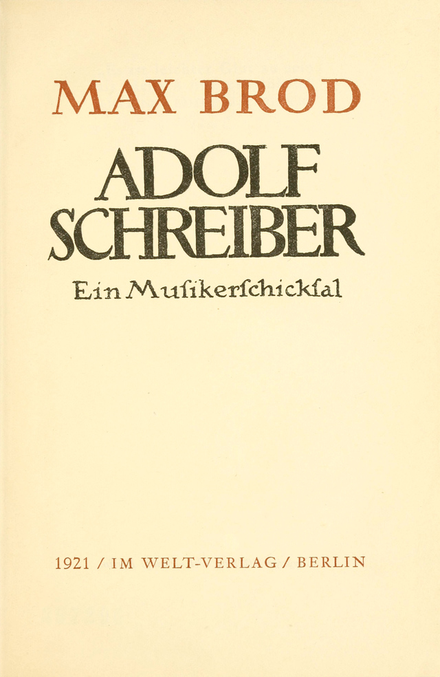 Adolf Schreibers Vater und der meine sind in demselben Haus der Prager Josefsstadt (Euphemismus für „Judenstadt“) aufgewachsen. Mein Vater machte die Bankkarriere, Schreibers Vater wurde Tapezierermeister. — Ich rekonstruiere nachträglich, daß das Erscheinen der gesamten Familie Brod bei dem Familienfest Schreiber als eine Art „Ehrung“ des arm gebliebenen Jugendgespielen gedacht war. Jedenfalls kam ich damals zum erstenmal in das bescheidene Häuschen Altprags (wir wohnten schon längst in der Neustadt). Nach der üblichen Konfirmationsrede spielte der kleine Adolf ein wenig Violine. Das entschied. Denn auch ich war damals schon eifriger Musikant, Klavierist. Wir beiden Kinder tauschten unsere Erfahrungen und Wünsche aus, jenseits aller sozialen Schichtungen, von denen wir ohnedies nur Schattenhaftes ahnten.