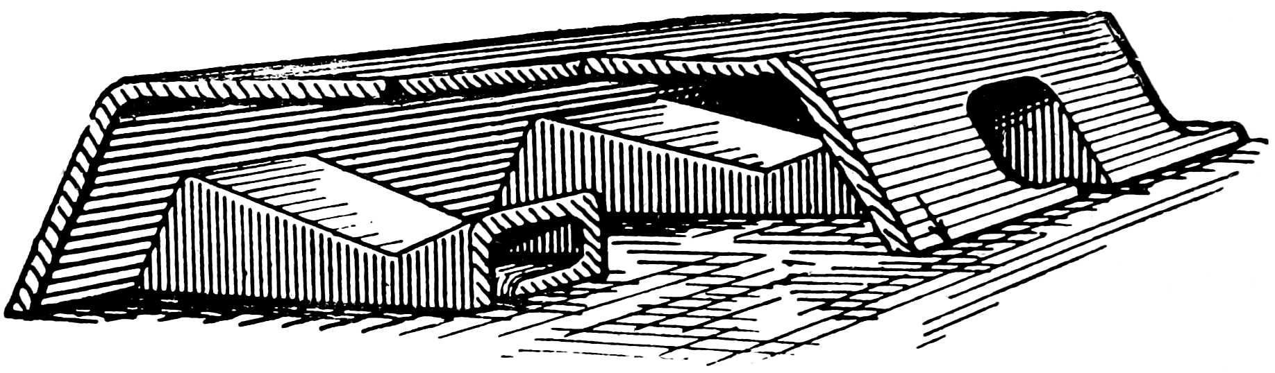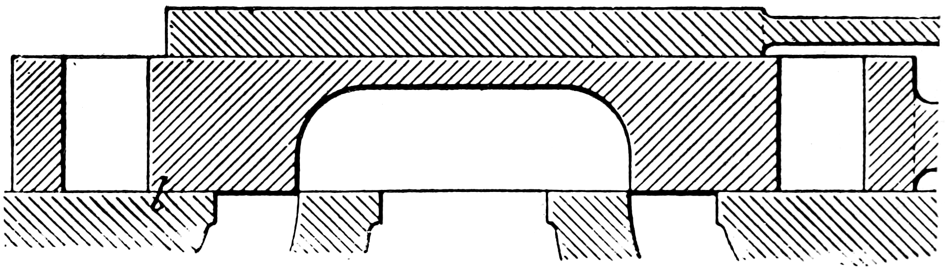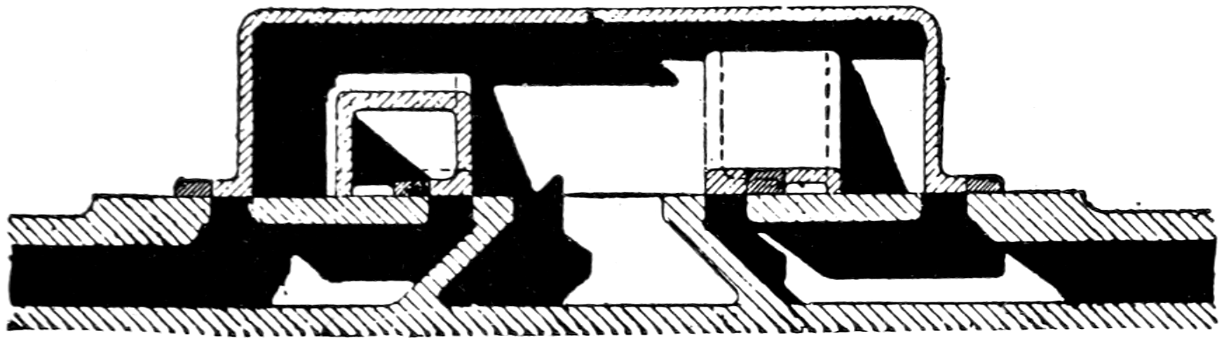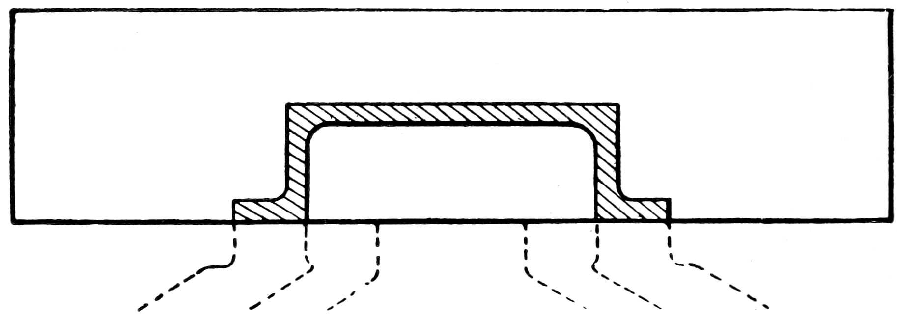 Let us return now to fig. 1. Draw, near the edge of a strip of moderately stiff paper, the section of the elementary form of slide valve illustrated by fig. 5, taking its dimensions from the ports of fig. 1, so that the two views agree in the manner indicated. By sliding this diagram backwards and forwards across the ports of fig. 1, the following explanation of the action of this, the simplest form of slide valve, will be readily appreciated.