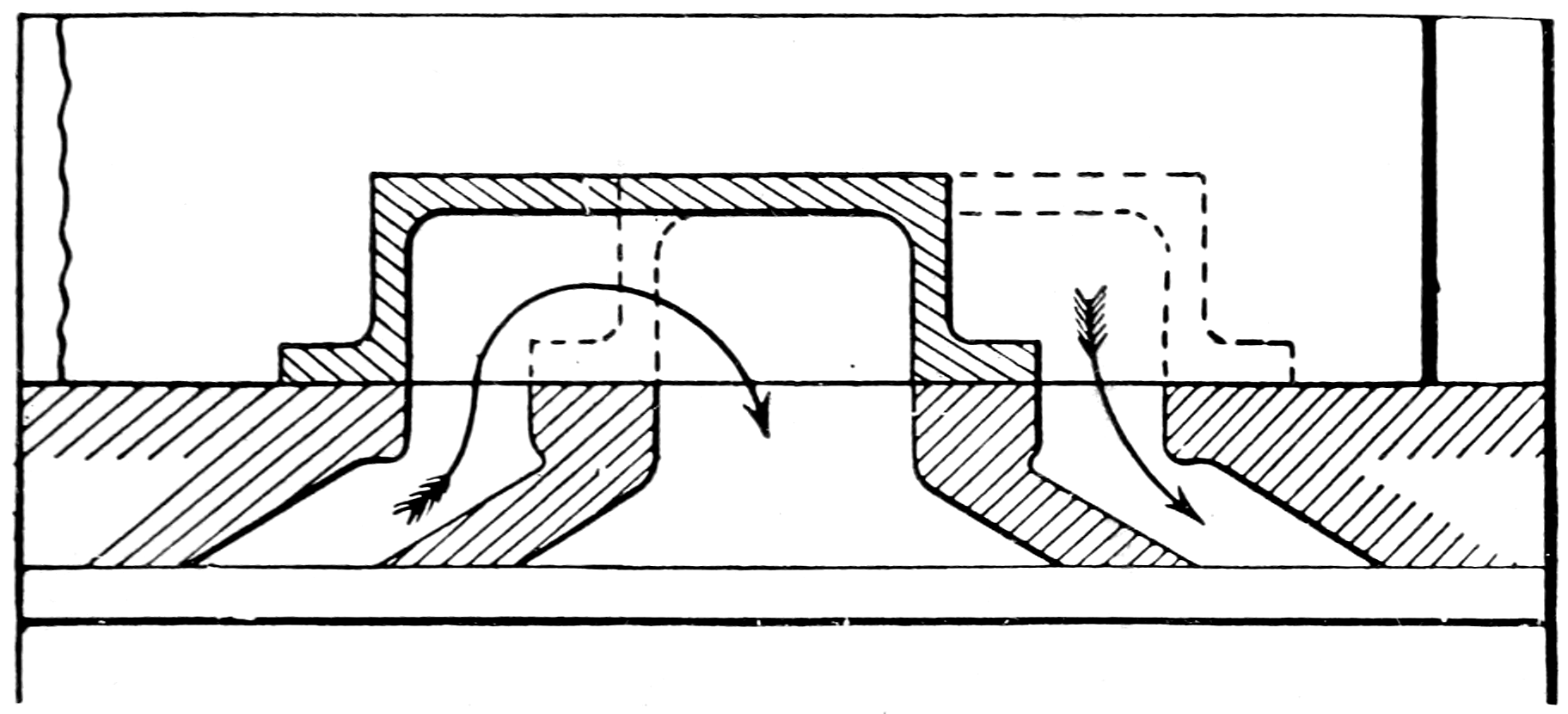 As a consequence of increased lap, the travel of the valve, made up of lap plus the required port-opening, will need to be increased correspondingly; the linear advance (the sum of lead plus an increased lap) will be increased also, and the valve will therefore come back earlier 74into its central position (where compression begins) than would the normal valve, so making compression begin earlier and last longer than before. In an unbalanced valve, this increased travel, together with the abnormal compression, cannot be tolerated, so that for obtaining an early cut-off without too much compression, with a sliding valve, gear of the “separate cut-off slide,” or Meyer type, is employed. This is characterised by a cut-off plate or plates on the back of a main slide valve, which may have the usual exhaust cavity, and in addition possesses supply steam-conduits leading through the valve from the back to the “lap-edges” (fig. 38). Exhaust and compression are timed by the edges of the central exhaust cavity; lead is given by the “lap-edges,” but cut-off is controlled by movement of the cut-off plates on the back of the moving main valve, so that though a “lap-edge” 75may not at any time have closed one of the steam-ports proper, a cut-off plate worked by a separate eccentric can close the appropriate steam-conduit above referred to, and so stop the current of steam flowing past the lap-edge to the still open port. Moreover, by a suitable setting of the eccentrics of the main and cut-off valves, it is possible to arrange that, at the instant of cut-off, the two valves shall be moving in opposite directions, and so shall effect a sharp cut-off, whereby wire-drawing is reduced.