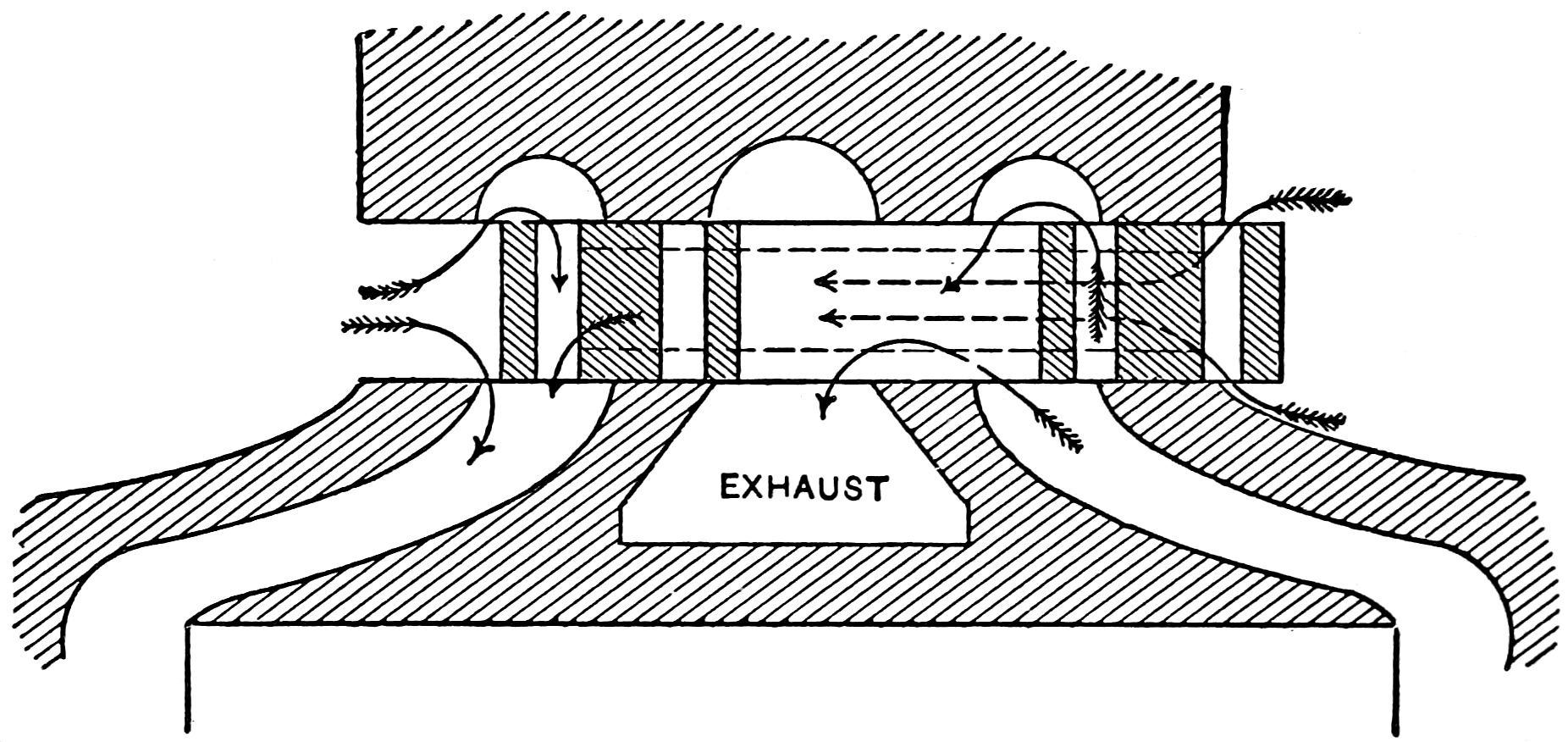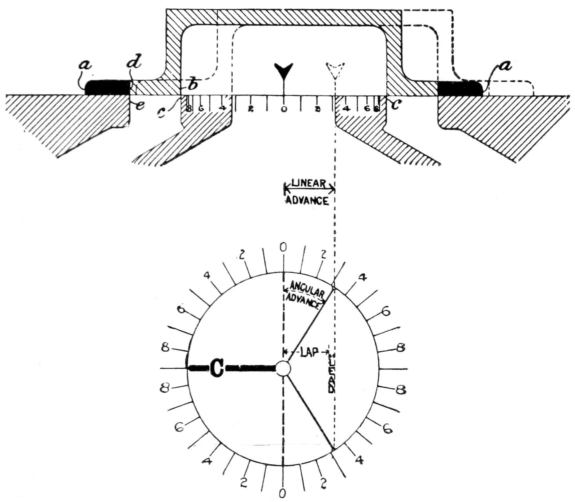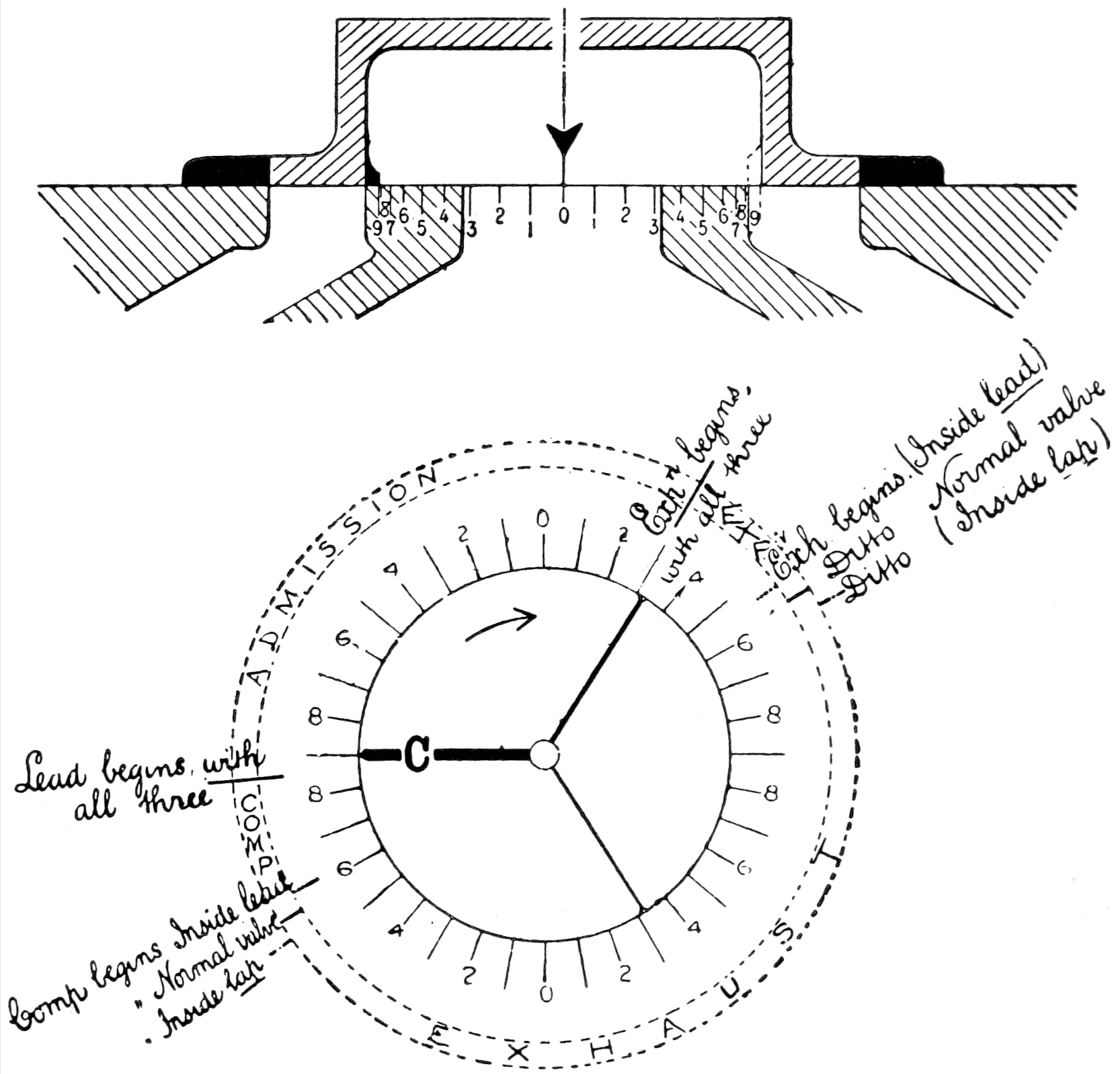 The upper portion of this diagram represents a section taken at right angles to the port-face through a set of steam and exhaust-ports as ordinarily arranged; the graduated ring beneath the section will receive consideration later.