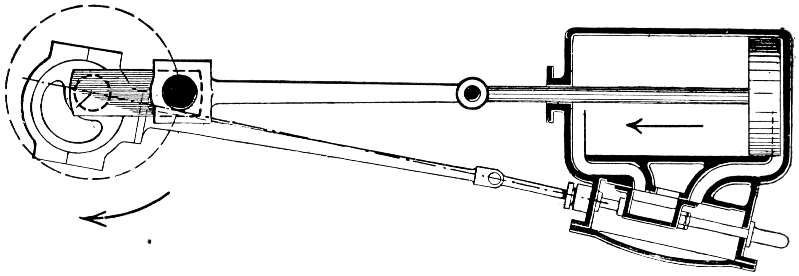 The Link Motion.—In engines whose duty frequently varies, as in the familiar case of a locomotive, permanent alteration of lap would not meet the requirements of the case, for the amount of expansion should be susceptible of ready variation at any time, in accordance with alterations in the weight of train, gradients, and weather. The link motion, in addition to being a reversing gear, is also a “variable expansion” gear. A precise analysis of any given case of link motion is a somewhat difficult operation, but, speaking broadly, the link motion may be said to provide what is virtually an eccentric of different throw and advance for each degree of expansion. Although, actually, the same two eccentrics remain constantly in use, the link motion may be so adjusted as to have an effect on the valve similar to that which would ensue 67upon the substitution, one for another, of different eccentrics as stated. Assuming that the lowest range of expansion is being used, the valve will have the travel, cut-off, and lead due for the most part to the throw of the actual eccentric and to its position with relation to the crank, almost as in the case of an eccentric whose rod is directly connected to the valve-spindle; now, as the link is raised (an operation sometimes termed “linking-up”) its centre gets nearer to the block on the end of the valve-spindle than it was before (i.e., nearer to “mid-gear”), and we get in effect:—