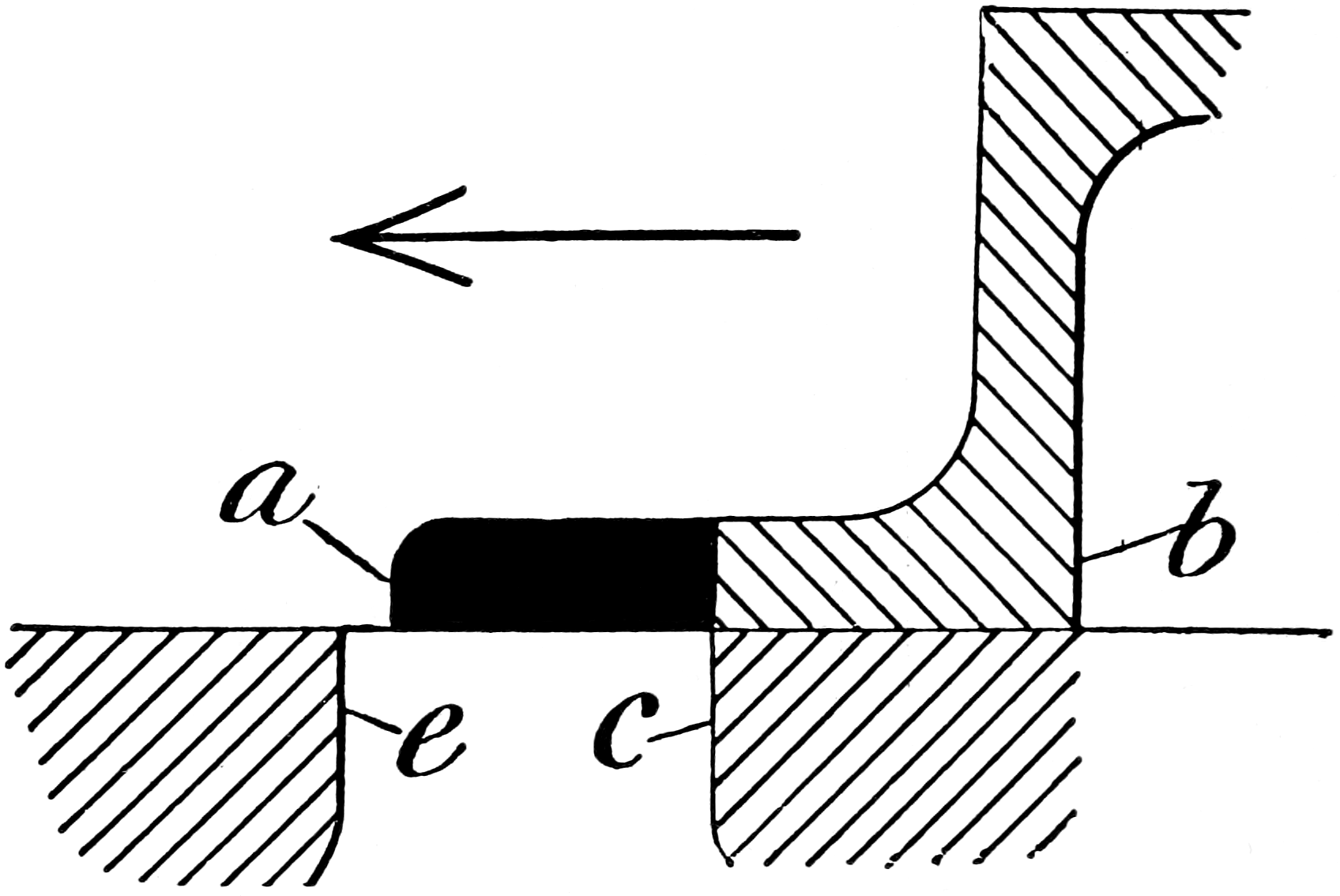 This seen, we can understand that in causing the edge a (fig. 18) to reach the edge e earlier in the stroke of the piston than it otherwise would do, we shall have hastened all the other operations so that they must occur earlier in the stroke (not necessarily by exactly the same amount for each, however, as we shall see further on), hence the edge b (fig. 18) arriving earlier at c, exhaust will commence before the piston completes its 37stroke, and also in returning to the right (fig. 19) the valve is earlier, and instead of the exhaust lasting during the whole of the return stroke some of it will be shut in by b and compressed before the returning piston until the edge a arrives at e, whereupon the lead commences coming in on and reinforcing the compressed steam. Thus it is that compression and lead together affect the cushioning, and consequently the piston is eased in stopping, and the return stroke is commenced without injurious shock or jar. A similar operation, of course, takes place at the opposite end of the cylinder when the piston arrives there.