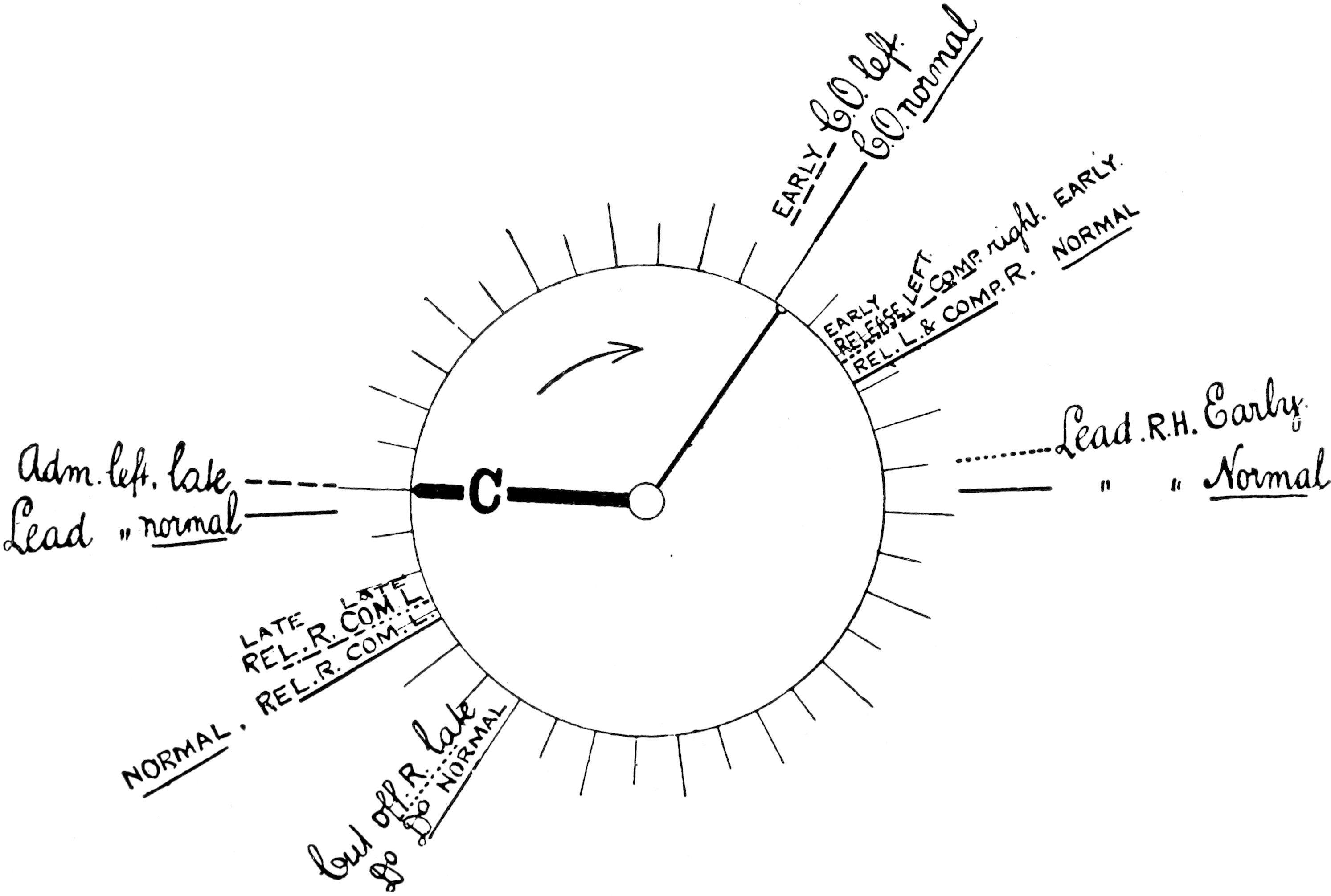 Further, taking the main crank-arm (C) as an index-finger, the position of its end at the points of cut-off, release, etc., with different valves and eccentrics, may be marked in pencil on the circular scale, or better, on a piece of tracing-paper interposed between the disc and that scale; by this means the student will obtain circular diagrams enabling him to compare the results due to different settings and proportions of gear, and he will also discover in what manner those results are affected by individual elements of the mechanism in any given example.