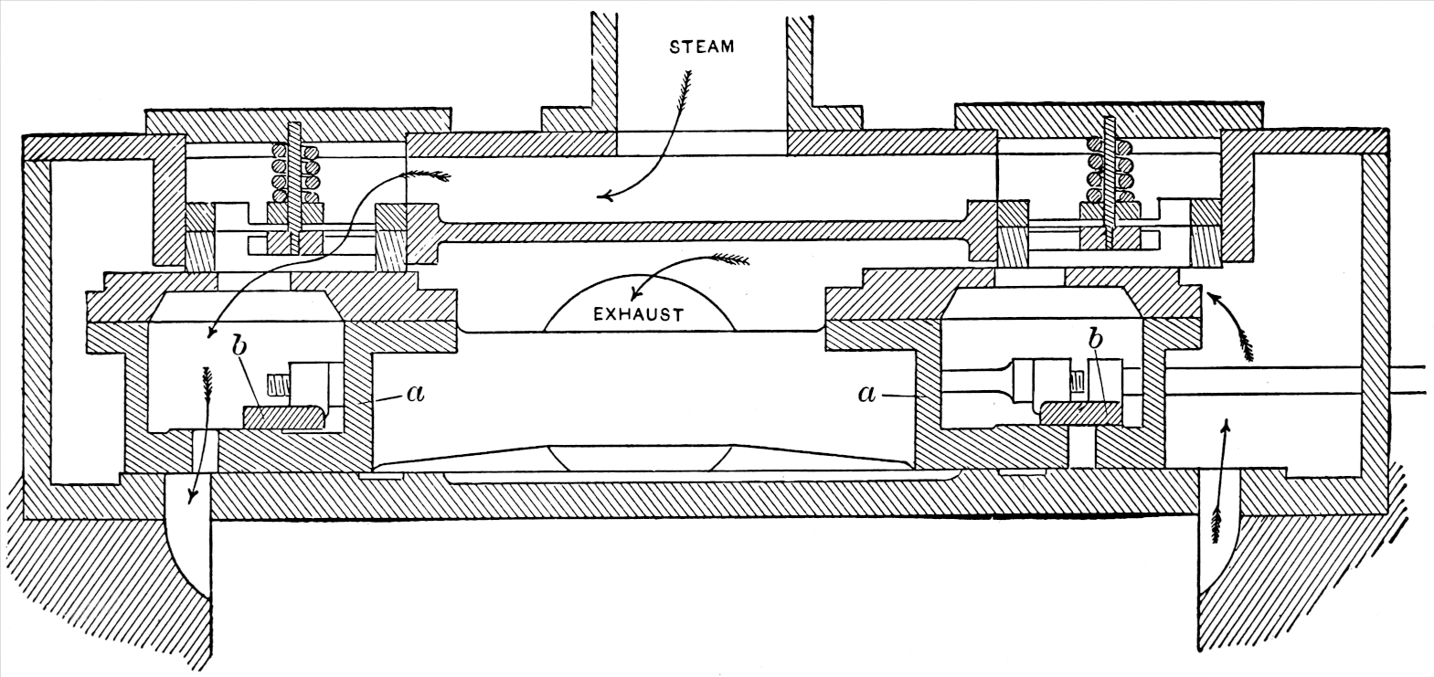 One of the best-known forms of double admission valves is the “Straight Line” or “Sweet” valve, which was invented by Professor John E. Sweet, formerly of Cornell University, and first used by him on the Straight Line engines. This valve is now used by a large number of manufacturers of automatic high-speed engines. The valve is shown in 49section in fig. 27, where a is the “cover plate,” and b is the valve, proper. The valve, b, moves back and forth between the cover plate, a, and the valve seat. The cover plate rests on pieces called “distance pieces,” placed at the sides of the valve. These distance pieces are made of such a thickness that while the cover plate cannot touch the valve, it is so close to it as to make a steam tight joint between the plate and the valve. Therefore, the valve acts as a piston of rectangular cross-section, moving back and forth between the cover plate and the valve seat. The result of its peculiar construction is that a balanced flat valve is secured; a valve which works with very little friction, as there is no surface upon which the steam can act so as to press the valve against the valve seat. The cover plate is kept in place by the pressure of the steam against its back, aided by one or two small springs inserted between the plate and the steam-chest cover.