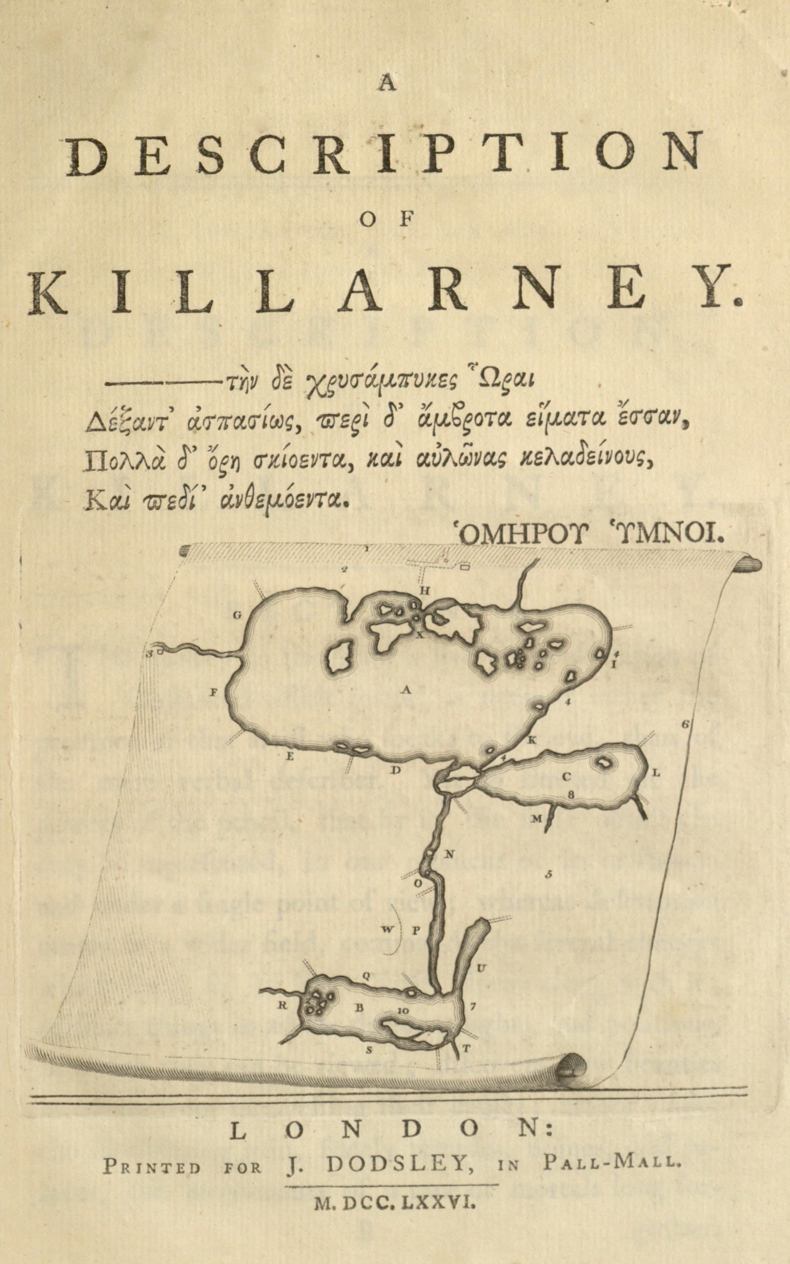 The estate of Macarthy-more, G, compleats the western boundary of the lake. The house is well situated, upon a rising ground near the river; but the improvements are much neglected. In alighting to take a view of the ancient family seat at Pallice, I gave the bridle of my horse to a poor boy, who seemed to look for it with a degree of eagerness. From his manner of answering some questions I asked him, I was led to enquire into his situation; and was not a little surprized to find, that though sunk in the most abject poverty, he was, nevertheless, a good classical scholar. He was well acquainted with the best Latin poets, had read over most of the historians, and was then busy with the orations of Cicero. I could not help pitying, at the same time that I admired him, and lamenting the hard situation which rendered his knowledge useless; his taste and refinements the sources of continual disgusts and mortifications; and even his habits of study pernicious, as they diverted him from those active employments, which alone could [9]keep him above want and wretchedness. I found, upon further enquiry, that this classical spirit is very general among the lower sort of people in Kerry: a circumstance, which gives an air of probability to the romantic accounts of a late Memoir-writer[1], concerning the learning and taste of certain northern shepherds.