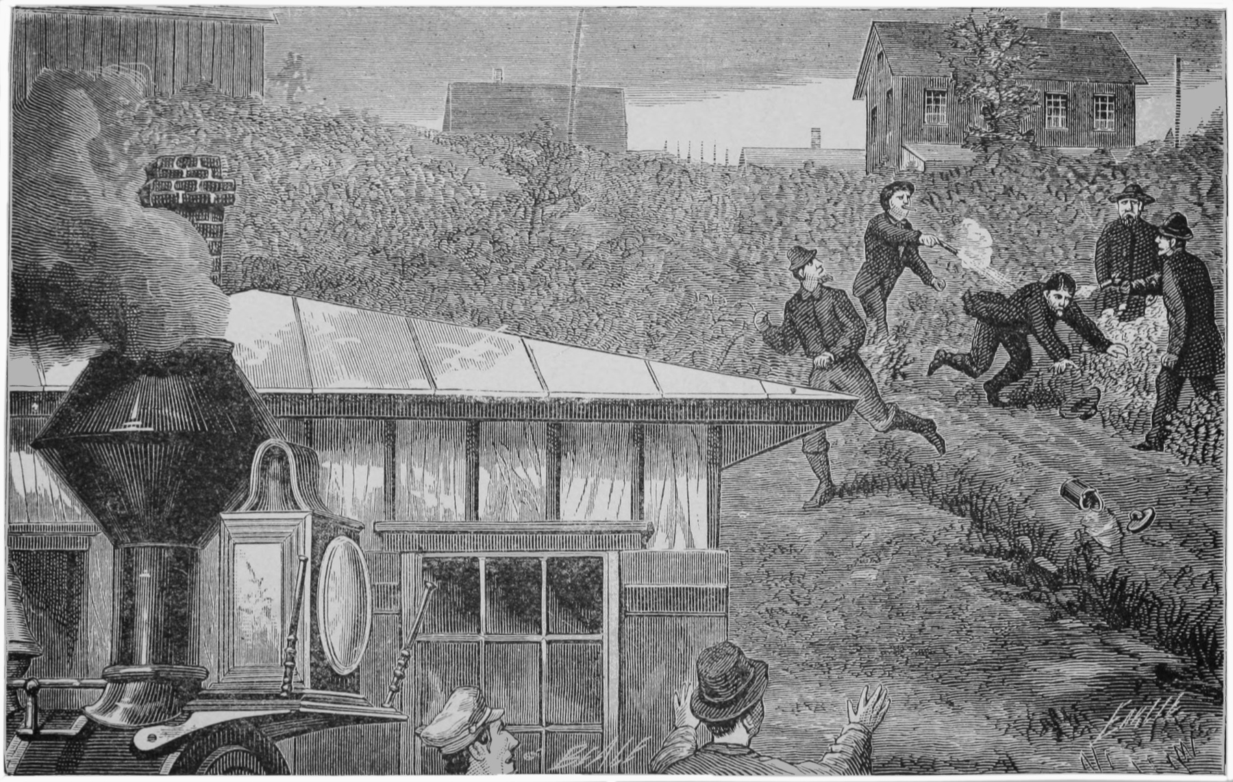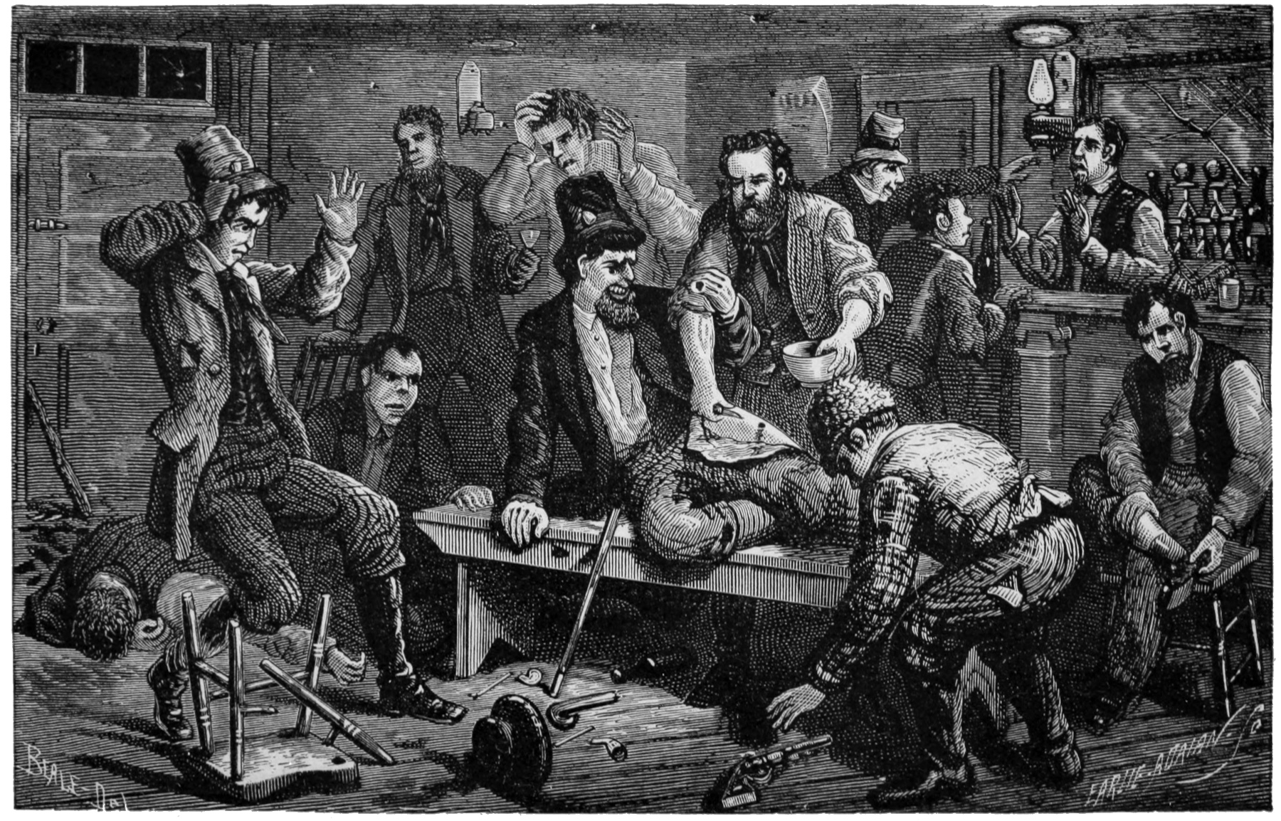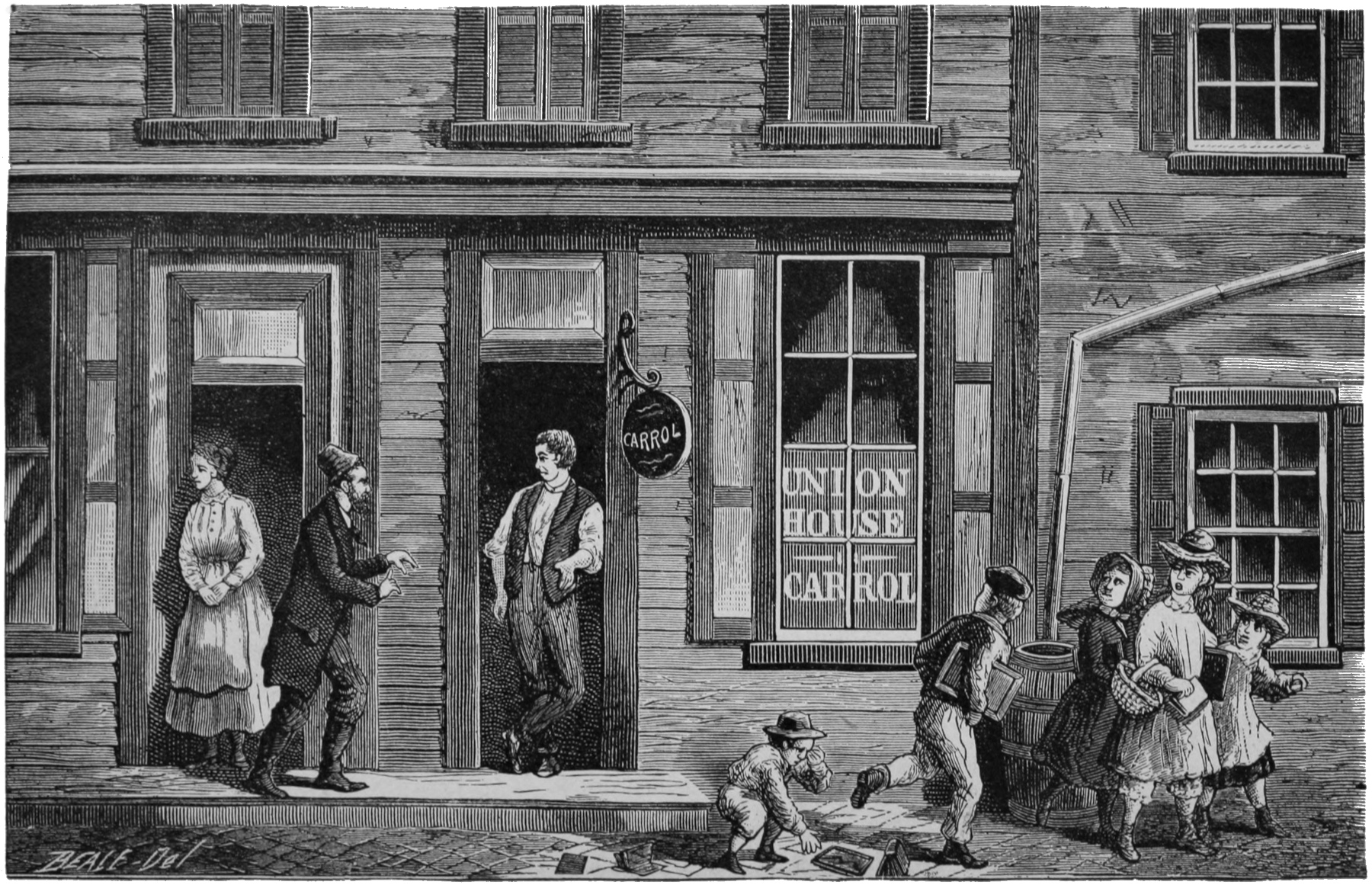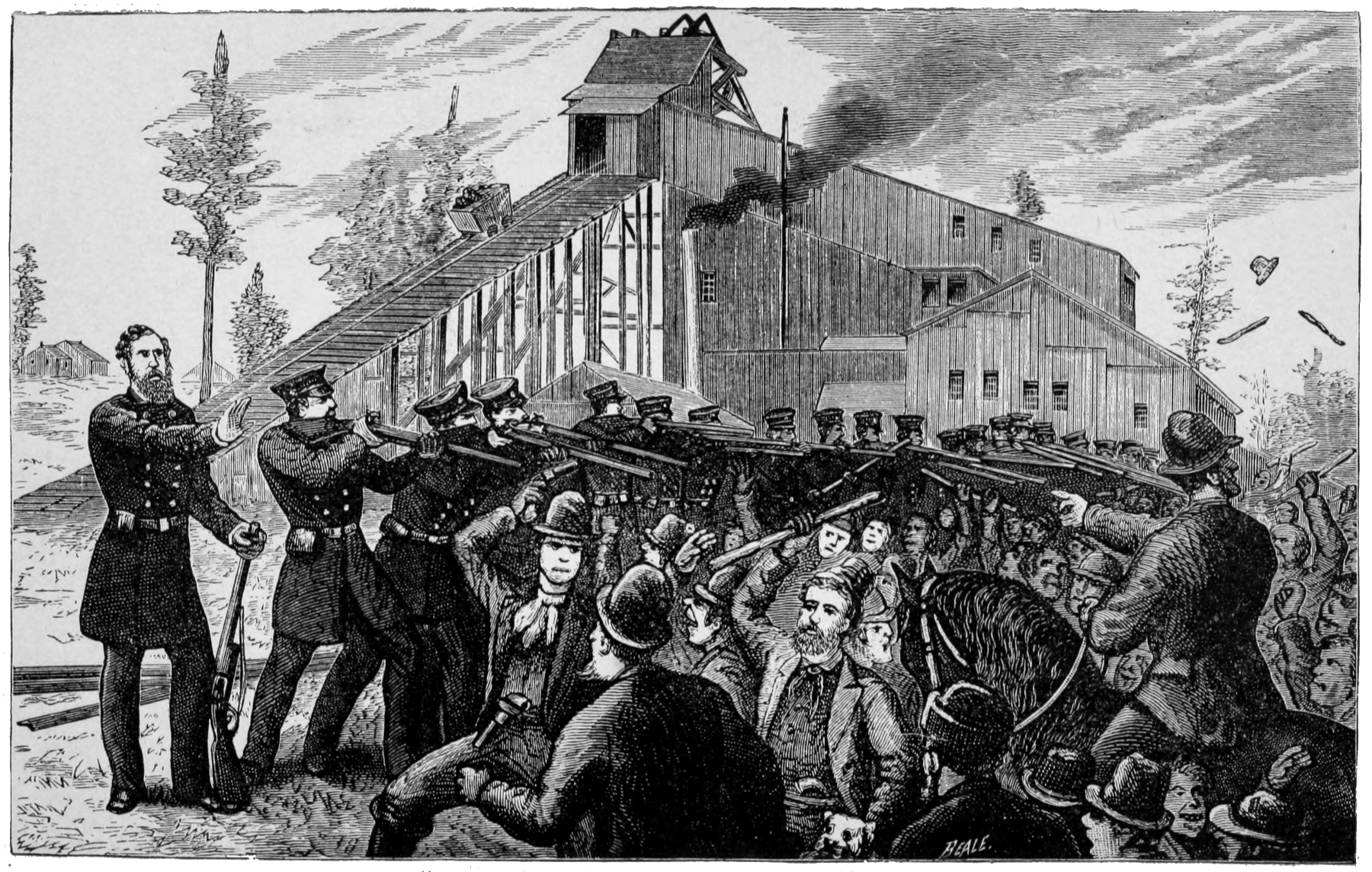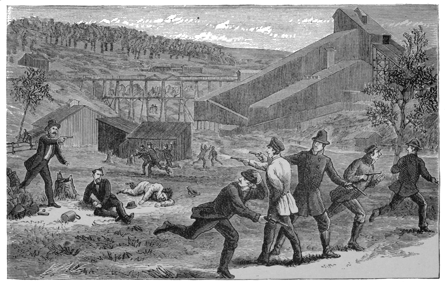 “At about a quarter to ten this morning, February 12, 1877, the stage from Rupert Station rattled up the street, into town, and disgorged its occupants in front of the Exchange 545Hotel. With Messrs. Hughes and Ryon, from Pottsville, the redoubtable Muff Lawler made his appearance. The meeting between Lawler and his old friend McParlan—Muff once knew him as McKenna, and initiated him into Shenandoah Division of the Mollies, a few years ago—was particularly interesting. Stretching out his hand, McParlan inquired of Lawler, as he indulged in a warm shake: ‘Have you the “goods” for the last quarter?’