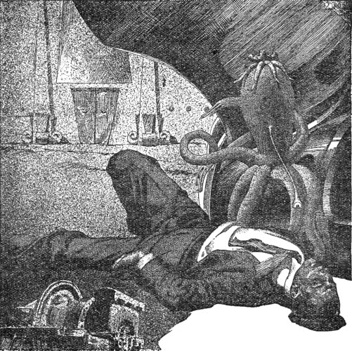 "He's a little under three feet tall," Henry cried. "His body is only half the size of his head and he has no legs. But he has six arms. He uses two to grasp with and the other four to glide with instead of walking. He has one eye on a sort of stem or tube, and it is luminous. He has an organ he hears with and it's got other senses we haven't. It looks like a sort of fleshy blossom on the top of his head."