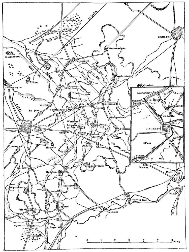 [25] Of Lukin Sir Douglas Haig wrote: “Coming to France in April 1916, his skilful command of the South African Brigade soon induced me to select him for command of the 9th Division. This division he has commanded with skill and ability in many hard-fought battles, and I have looked on him as one of the most reliable divisional commanders in France.” Lieut-Col. Croft in his Three Years with the 9th Division has this pleasant tale of Lukin at Third Ypres: “In the early stage of the night march we met the divisional commander, who, like all the divisional commanders of the 9th Division, spent most of his time near the front lines. He was on his way back, and this good old regimental officer insisted on getting off the track and up to his knees in mud while the men went by, saying, ‘I have a comfortable dug-out to go back to,’ when we offered to make way for him.”