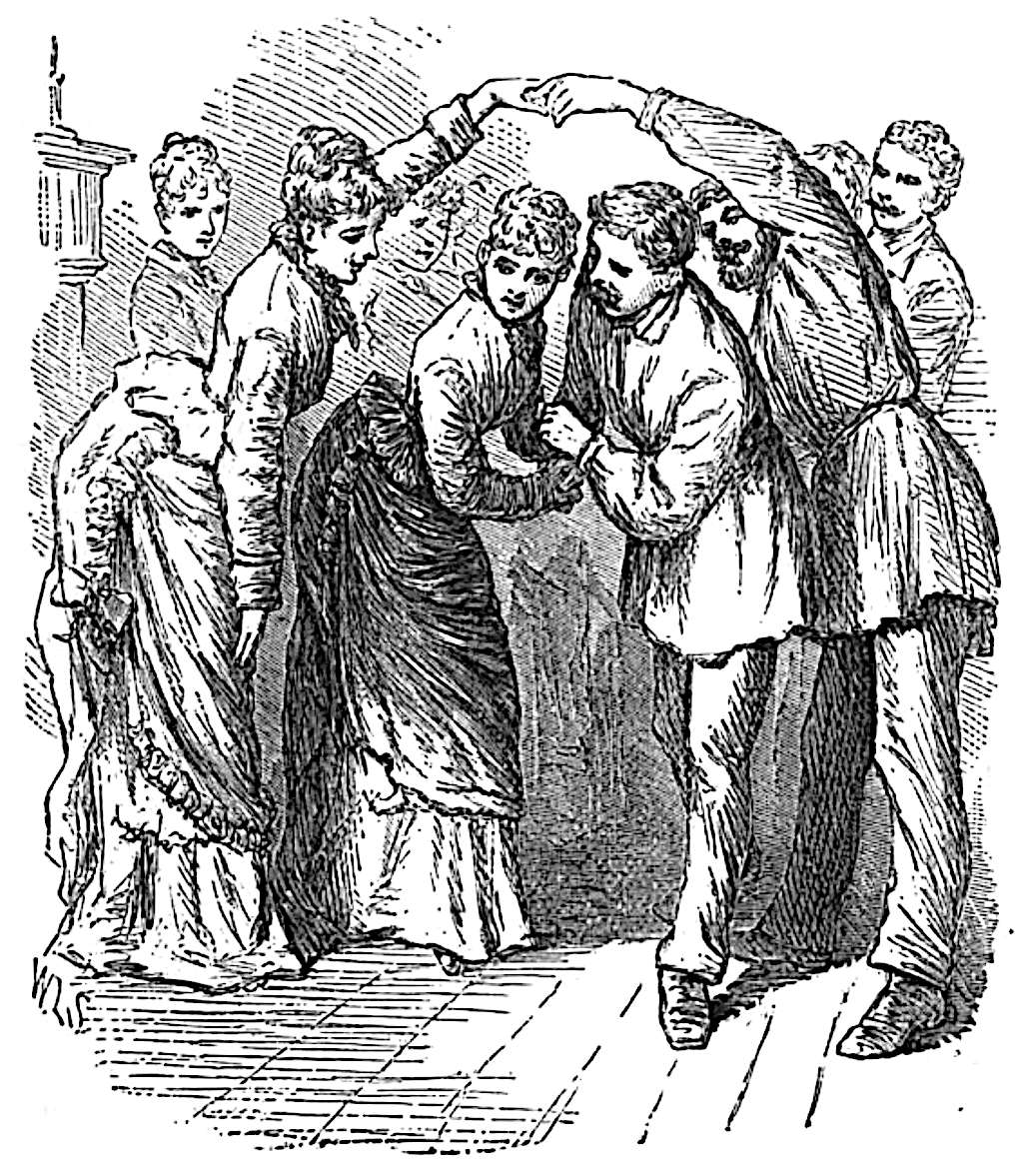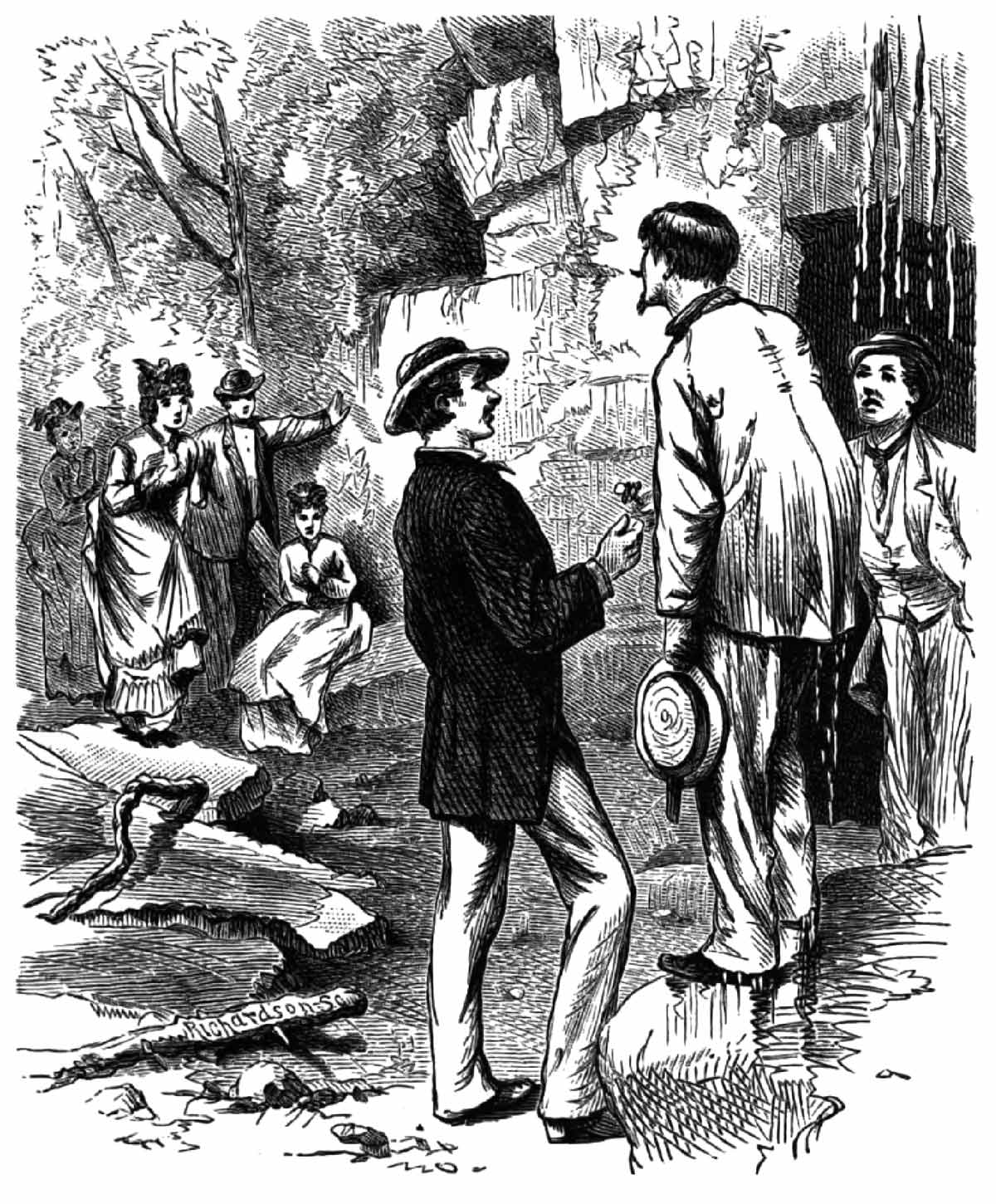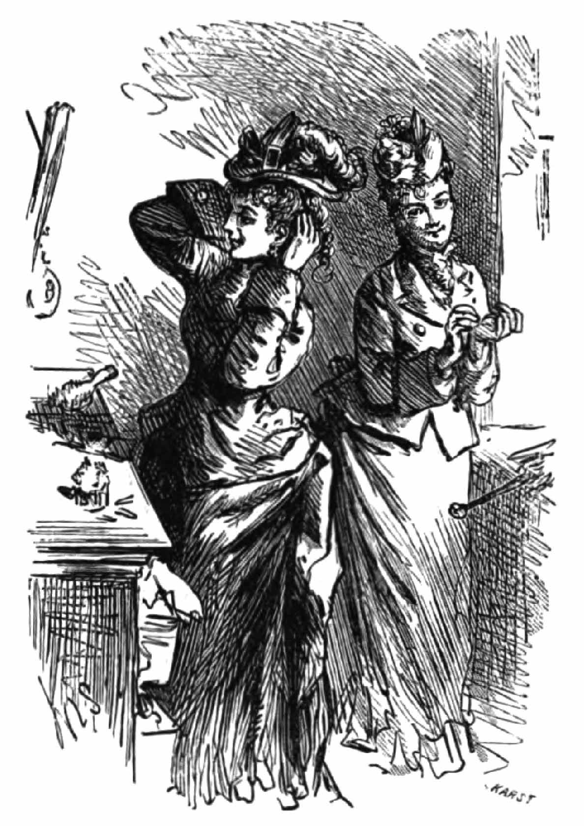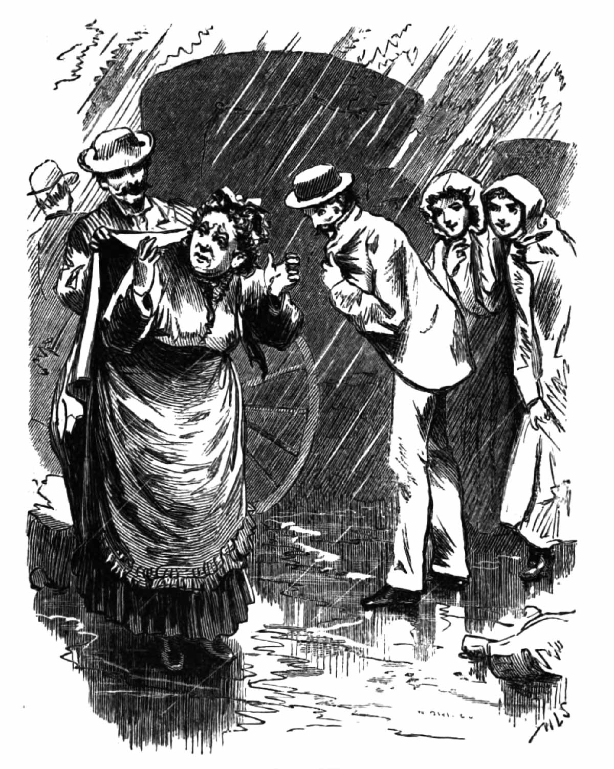 “Oh, he must not do that!” cries Sylvia, alarmed. “The hat is not worth any risk— in fact, I don’t care about it at all. Of course, it is utterly ruined. Charley!” (elevating her voice), “O Charley! please come away! Let the hat alone!”