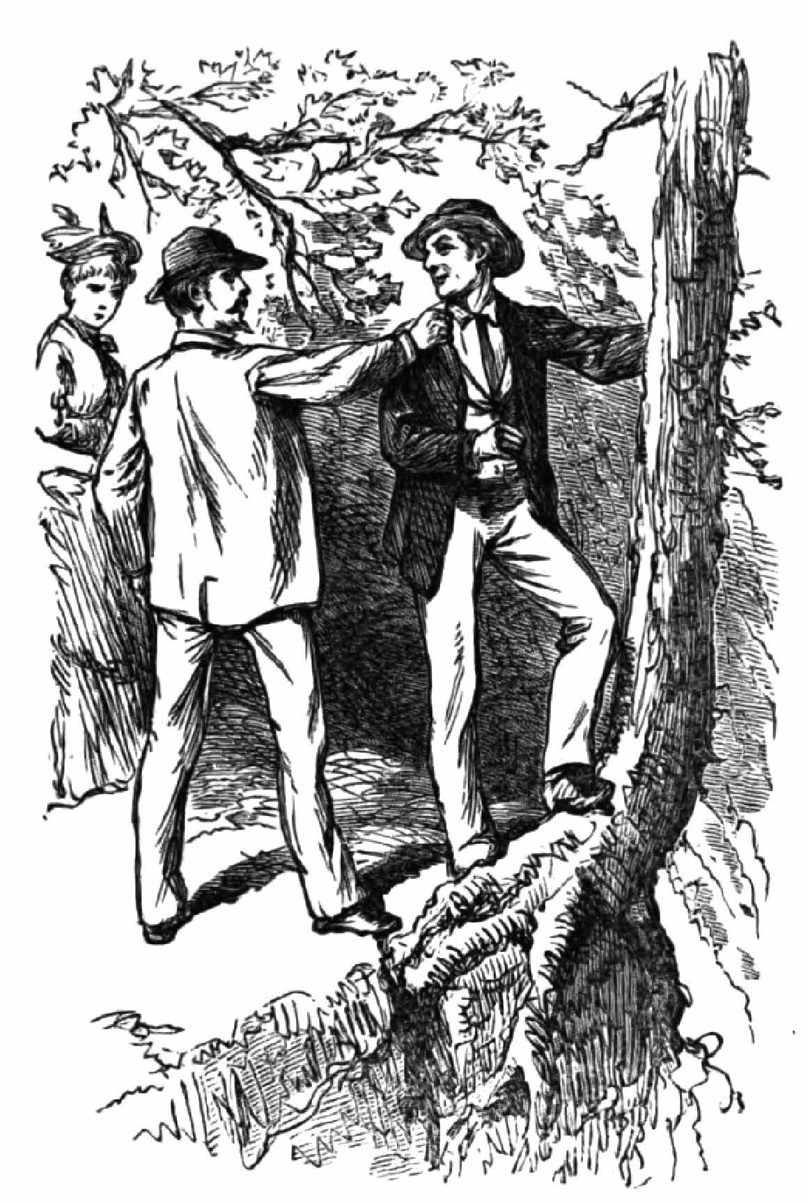 She advances out on the trunk as she speaks. It is certainly wide enough to afford good footing, but the farther end does not rest very firmly against the opposite bank, and the consequence is that it shakes as she walks. This, added to the fact of her elevation (six feet, at least) above the stream, with a sweeping fall on each side, and swift-rushing water underneath, makes her, as she afterward confesses, suddenly and unaccountably giddy. She stops, and Charley, seeing her change of color, springs into the water above which she has paused, and seizes the only thing within his reach—one of her feet!