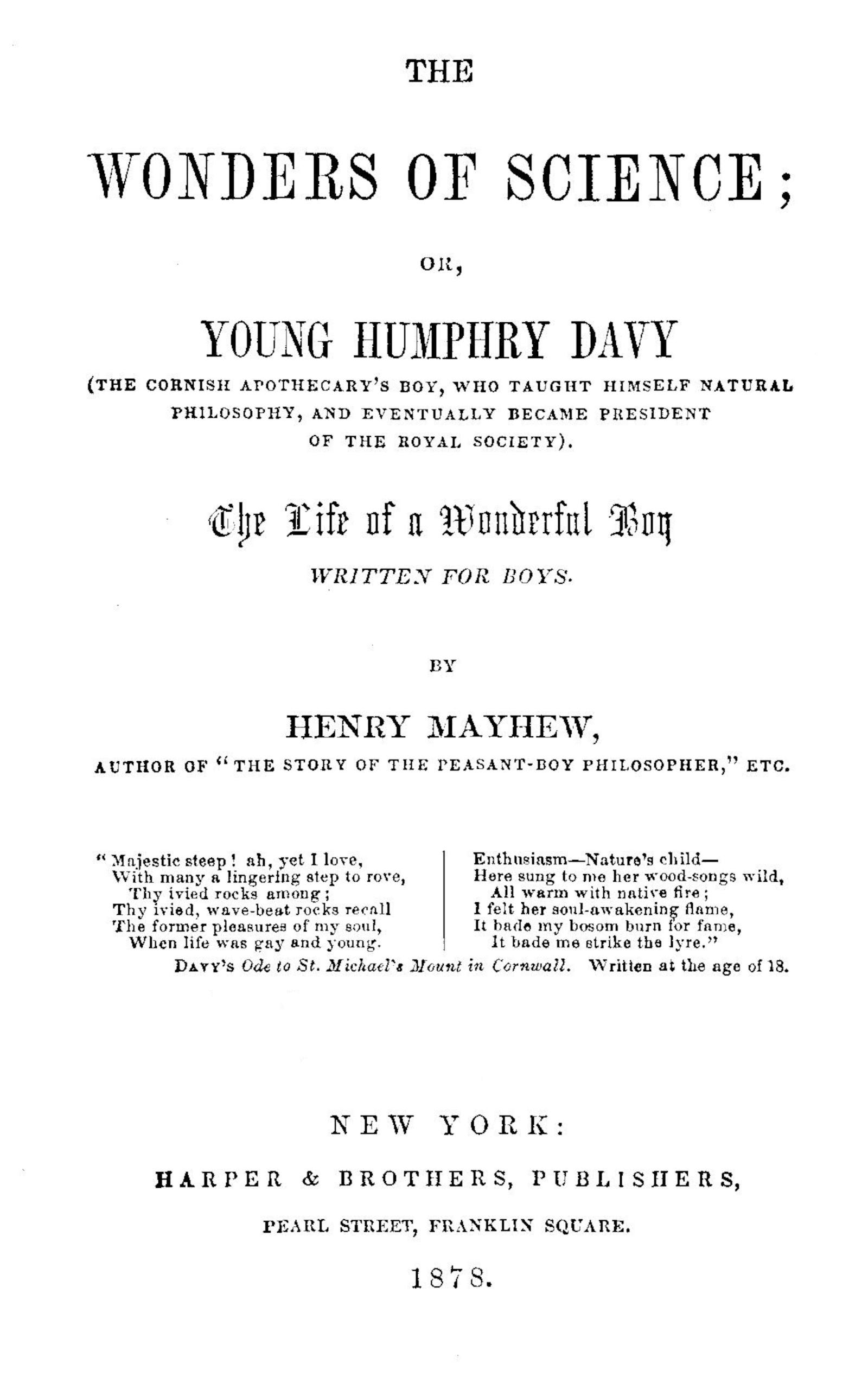 First of all, because Davy was, as it were, the foster-father of your great genius; and, secondly, because it allows me to tell the lads for whom this book has been written the graceful story of the way in which the hero of it first befriended you—the young “bookseller’s apprentice, very fond of experiment, and very averse to trade”—in your own dignified language; and, moreover, because I know your zeal in the cause of education, and that you are, like all generous minds when fired with the [vi]beauty of fine truths and discoveries, unable to rest, as it were, till you have imparted them to others, and so made them as happy as yourself with the wondrous knowledge. Indeed, it is the glorious privilege of intellectual pursuits that they are not marked by that “selfishness,” which made you as a boy “desirous of escaping from trade;” for wisdom, happily, can share its riches with the world, and yet be all the richer for the sharing. None know better than yourself that every science is built up of an infinity of such contributions; and that, had the human mind been impressed with a desire to hoard its intellectual gains—to keep them locked in the coffers of the brain—how little even you—who have added, by your many profound discoveries, more to the knowledge-fund of the world than any other single philosopher—could yourself have known. There is no finer instance, perhaps, of human magnanimity than the chemist working unseen in his laboratory—watching alone for hours the action of different kinds of so-called dead matter upon each other, in the hope of being able to add his little mite of truth to that store of mental riches, which is to benefit not only his own generation, but all those to come for ages after. Nor can we detract from the natural greatness of the act by ascribing it to any lower principle of our soul—such as that petty craving for praise which we call “vanity” in women, and a desire for fame among poets and philosophers; for every true scientific [vii]mind knows that there is sufficient reward in the intense beauty of a new discovery—the first flash across the brain of some deep insight into the mysteries of Nature—to repay him, over and over again, for all the long puzzling of his thoughts; and that, were he even alone in the world, without a voice to cheer him on, he must still continue spelling out passage after passage of the Great Poem of Creation, from the mere love of the Poem itself.