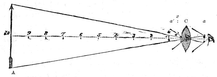 [57] The arrangement of lenses, above described, constitutes the principle of what is termed the “astronomical telescope;” for this makes the objects appear upside down. But, though the inversion of a star or planet is a matter of no moment in astronomical observation, such an effect is most disagreeable when applied to terrestrial objects. The ordinary telescope for land purposes, therefore—or the “day telescope,” as it is usually styled—has two other lenses behind the eye-lens. These lenses have both the same focus as the eye-lens itself, and are placed at a fixed distance from each other, such distance being equal to the sum of their focal lengths: that is to say, if the eye-lens have a focus of 2 inches, then each of the two other glasses should have the same length of focus, and be placed at 4 (2 + 2) inches apart from one another. The magnifying power of the day telescope may be calculated in the same manner as that of the astronomical one above explained; for the two additional lenses in the day instruments, having the same focal length as the eye-lens itself, produce no further enlargement of the objects, but serve only to cross the rays a second time, and so to render the image erect instead of inverted.