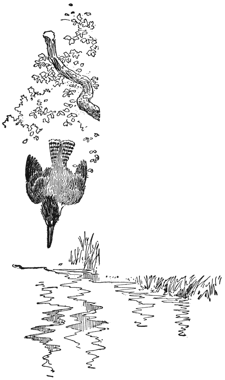 Koskomenos, de ijsvogel graaft nog een hol in den grond, zooals zijn kruipende voorouders; daarom noemen de andere vogels hem een verstooteling en willen ze niets met hem te maken hebben. Maar dat kan hem weinig schelen, want hij is een ratelende lawaaimaker, een zelfingenomen beest, dat den heelen dag niet anders te doen schijnt te hebben dan te visschen en te eten. Wanneer ge hem echter nagaat, merkt ge met verbazing op dat hij sommige dingen merkwaardig goed kan—eigenlijk beter dan iemand anders van het boschvolkje. Nauwkeurig de plaats van een visch te bepalen in stilstaand water is al moeilijk genoeg:—denk maar eens aan de straalbreking! Maar als de visch beweegt en de zon blikkert op het diepe water en de wind het oppervlak in tallooze sparkelende, wisselende voren en rimpels fronselt, dan moet de vogel, die den snavel pal op zijn visch kan richten en hem precies achter de kieuwen kan raken, meer in zijn kop hebben dan ’t gewone ratelende gekakel, dat men meestal aan de forellenbeken van hem hoort.