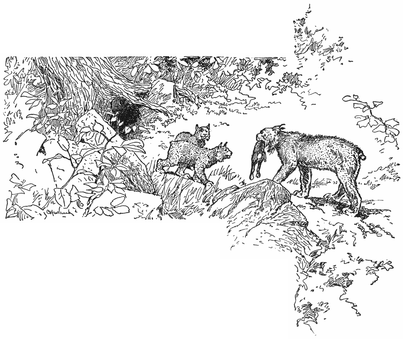 Dat Pekompfs listigheid van de soort der katten is: achterdocht, zonder het sluw overleg of de kracht van den vos of den wolf, blijkt eigenaardig uit een gewoonte die lynx en wilde kat gemeen hebben, namelijk: dat ze al wat ze rooven meesleepen naar den top van een hoogen naaldboom om ’t te verslinden. Als ze een haas of een visch eerlijk zelf gevangen hebben, eten ze dien gewoonlijk op de plaats zelf op; maar als ze zoo’n dier uit een strik of een bergplaats stelen, of van een kleinen jager, keert de kattenachterdocht terug—mèt een vaag besef van kwaad te doen, dat alle dieren in minder of meerdere mate hebben—en ze maken zich met den buit uit de voeten en eten hem gulzig op, daar waar ze meenen dat niemand hen ooit zal ontdekken. [52]