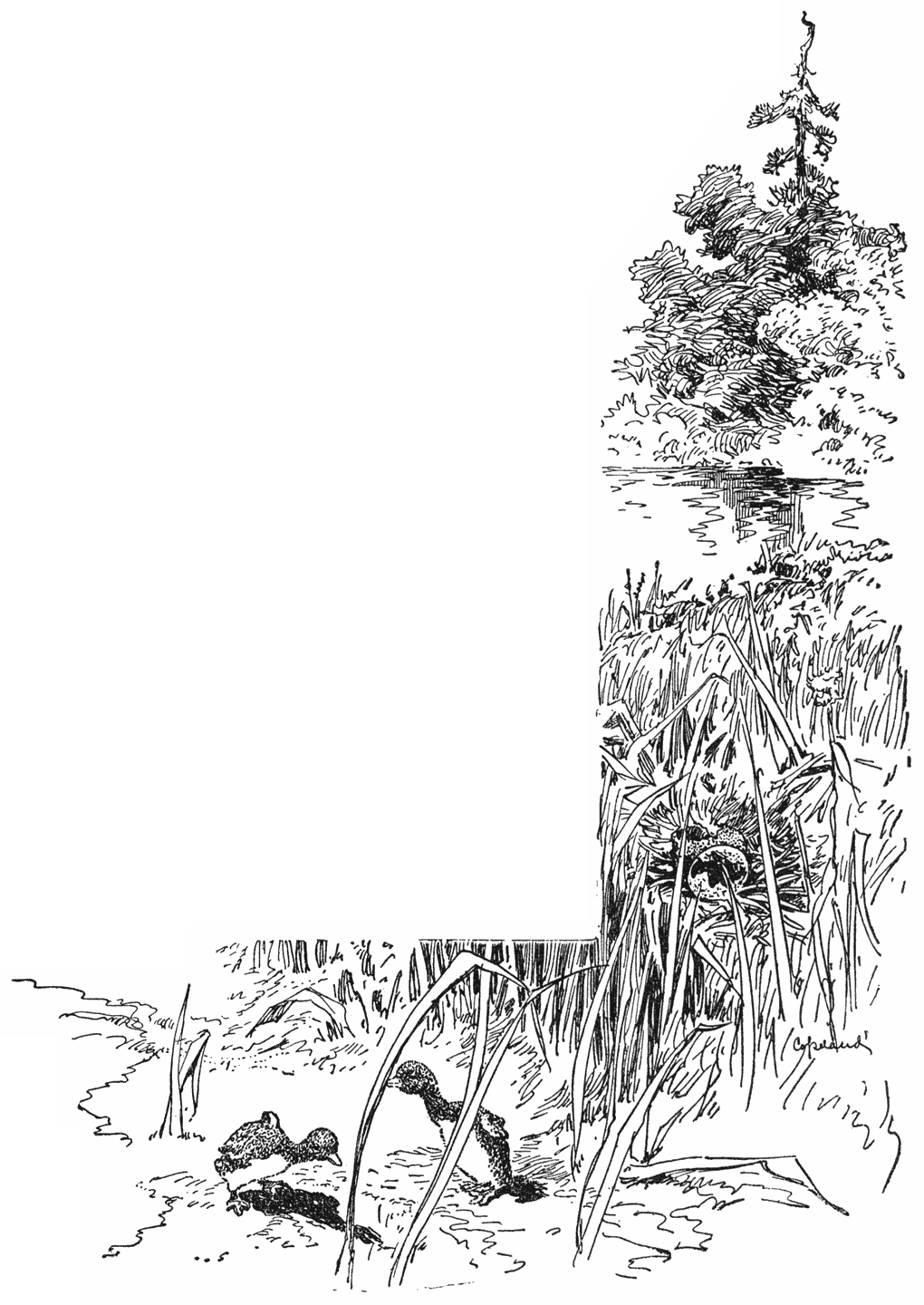 Eens, terwijl de moeder uit visschen was, kwamen de jongen uit hun schuilplaats in het riet en waagden zich een eindje de baai in. Het was hun eerste reis alleen de wereld in; ze waren geheel vervuld van het merkwaardige en gewichtige van de zaak. Plotseling, terwijl ik toekeek, stoven ze wild uiteen, en bewogen zich verbazend snel voort voor zulke kleintjes, luidkeels piepend. Van den oever stroomop, was een haastige rimpel scherp over ’t water geschoten tusschen hen en het eenige stukje moeras, waar ze thuis waren. Vlak achter den rimpel kwamen de spitse snuit en de kraaloogjes van Musquash, die altijd dergelijke dingen in haar schild voert. Op een van haar sluiptochten had zij het broedsel ontdekt; nu stelde zij alles in ’t werk om de verschrikte jongen in beweging te houden, tot ze uitgeput zouden zijn, en zij [118]zelf zorgde er voor tusschen hen en den oever in te glippen.