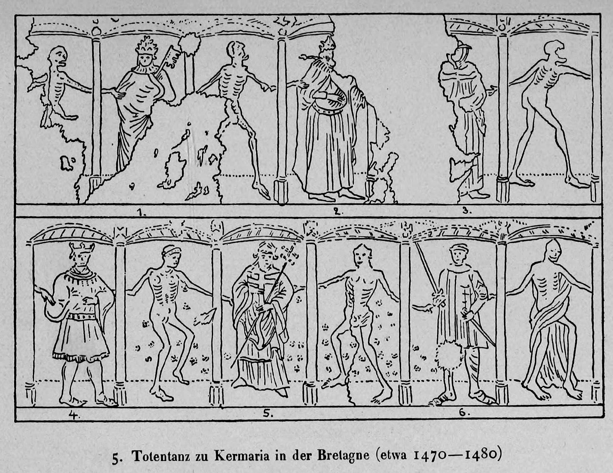 Die wissenschaftliche Begründung für das hier knapp Vorgetragene (nur das Bild von Kermaria habe ich jetzt später angesetzt), besonders für die geistesgeschichtliche Einstellung von Bild und Text der Totentänze und für die Entstehung der Verse, habe ich in meinem Buche: »Die Totentänze des Mittelalters« (München 1922, Horst Stobbe) gegeben; dort ist auch die wichtigste Literatur verzeichnet.