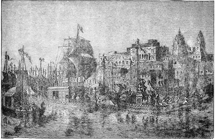 With such thoughts we kept our eyes fixed on that glittering vision, as if we feared that even as we gazed it might vanish out of our sight. Below us the Jumna, flowing silently, seemed like an image of human life as it glided by. And so at last we turned to depart, and bade farewell to the Taj, feeling that we should never look at it again; but hoping that it might stand for ages to tell its history of faithful love to future generations. Flow on, sweet Jumna, by the marble walls, reflecting the moonbeams on thy placid breast; and in thy gentle murmurs whispering evermore of Love and Death, and Love that cannot die!