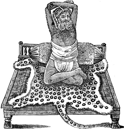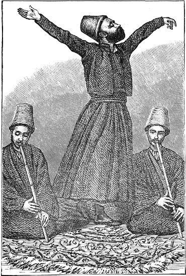 The Dervishes are Mohammedan monks. They are among the most curious devotees of the Moslem religion. They perform their wonderful feats on Friday afternoons in the mosques. Dr. Philip Schaff writes of one of their performances which he witnessed: “After the preliminary[749] exercises of prayer and prostration, they whirl around on their toes, ring within ring, without touching each other, for about an hour, until they are utterly exhausted. I saw thirteen of them all dressed in flowing gowns, and with high white hats of stiff woolen stuff; their hands were stretched or raised to heaven, their eyes half closed, and their minds apparently absorbed in the contemplation[750] of Allah. They made about forty or fifty turnings a minute. The Howling Dervishes swing their heads up and down, crying incessantly with all their might, ‘La llaha, ill’ Allah!’ and some other phrases, until they are stopped by sheer exhaustion.” All this is done for the same reasons for which the Fakirs of India, and the devotees of other nations torment their bodies.