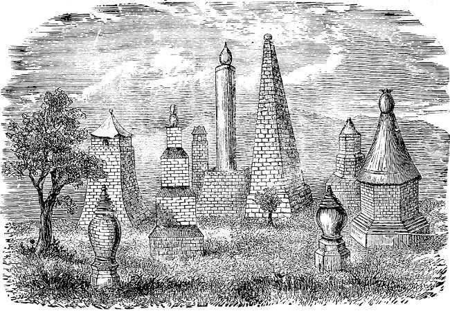 It stands on the banks of the Jumna, a mile below the tort at Agra. As you approach it, it is not exposed abruptly to view, but is surrounded by a garden. You enter under a lofty gate-way, and before you is an avenue of cypresses, a third of a mile long, whose dark foliage is a setting for a form of dazzling whiteness at the end. That is the Taj. It stands, not on the level of your eye, but on a double terrace; the first, of red sandstone, 20 feet high and 1,000 feet broad, at the extremities of which stand two mosques, of the same dark stone, facing each other. Midway between rises the second terrace, of marble, 15 feet high and 300 feet square, on the corners of which stand four marble minarets. In the centre of all, thus “reared in air,” stands the Taj. It is built of marble—no other material than this, of pure and stainless white, was fit for a purpose so sacred. It is 150 feet square (or rather, it is eight-sided, since the corners are [761]truncated), and surmounted by a dome, which rises nearly 200 feet above the pavement below.
