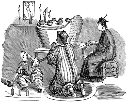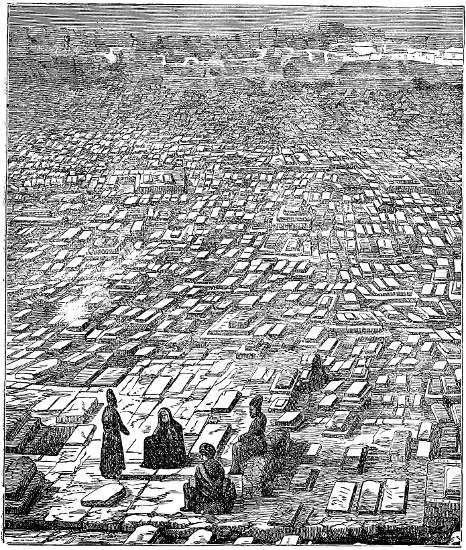 The congregations of the faithful gather for worship in the mosques on Fridays. This is the Moslem Sabbath, because, say they, Adam was created and died on Friday, and because on Friday the world will be judged. The worship consists simply of prayers and washings, with an occasional sermon on a text from the Koran. During the service every one maintains the utmost solemnity; though, after the service they lounge, chat and even make bargains in the sacred building. On entering the mosque, the Moslem removes his shoes, carrying them in his left hand, sole to sole, with great care, putting his right foot first over the threshold. He then goes through with the necessary ablutions (often a mere sham, a mere going through the motions,) and takes his place[748] upon the matting, laying his shoes before him. The worshipers generally arrange themselves in rows facing the niche toward Mecca. Women seldom go to the mosques, and if they do, they sit apart from the men. The reason for this is that the Koran does not say that women must pray, and many Moslems believe that women have no souls. Yet they believe that they will enter Paradise, but this is only that they may continue to be slaves of men; each of the faithful is to have in Paradise, so they believe, 80,000 slaves and 72 wives, in addition to those he had in life and who evinced a faithful spirit.