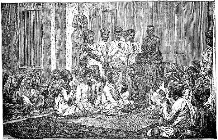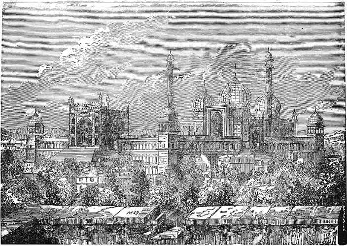 In Delhi itself is probably the finest Mohammedan mosque in all India. This is called the Jummah Musjid (the Pearl Mosque). It is built entirely of sandstone, and is raised upon a high terrace. This masterpiece of Indo-Mohammedan architecture is the most venerable monument of the Moslems in India. Vivid though severe colors clothe every part of the building. After mounting long flights of steps, the visitor passes through huge bronze doors into a large, open court, with a fountain in its centre. At one side is a piece of black marble, in which is the print of Mohammed’s foot—at least, the priests[755] say so. In the interior, the roof, pillars and pavement are of the purest white marble, embroidered with finest arabesques. These arabesques are composed of colored marbles, and precious stones inlaid in the marble in various patterns of scroll-work or of inscription. Bishop[756] Heber said of this structure: “This spotless sanctuary, showing such a pure spirit of adoration, made me, a Christian, feel humbled, when I considered that no architect of our religion had ever been able to produce anything[758] equal to this temple of Allah.” But the worship is not now so pure. The building is reverenced by the Mohammedans, not merely on account of its age or wondrous beauty, but because it contains a most highly esteemed relic of Mohammed. From a small nook of solid marble, with a carefully-locked door, the priests take, for the inspection of visitors and devotees, a small silver case; with slowest, most cautious reverence, the casket is unlocked, and the priest exposes to view—a hair from Mohammed’s beard. What would that fierce hater of relics and idols, Mohammed, say, could he but see how far his modern disciples have departed from his teachings? Besides the hair, they retain as relics a garment and a pair of sandals which once belonged to the prophet.