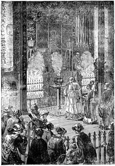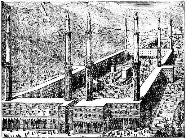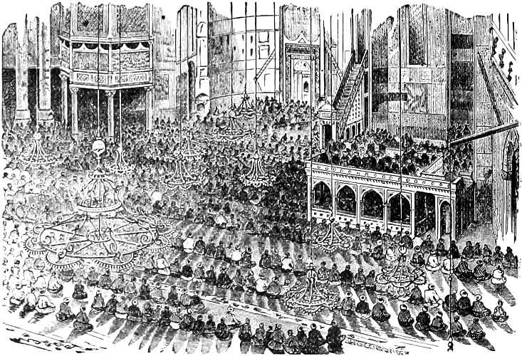 One of the most celebrated mosques is that of St. Sophia, at Constantinople. This was once a Christian cathedral. It was originally built by Constantine the[754] Great, in 325 A.D. It was destroyed in 404 A.D., rebuilt, and again destroyed in 532. After this Justinian restored it. It took seven years to build it. Ten thousand workmen were employed in its erection. It was built of materials gathered from all over the Roman Empire, and comprised remains of almost every celebrated heathen temple of ancient times. The dome of the tabernacle was of solid gold, and was surmounted by a solid golden cross, encrusted with precious stones, in all weighing seventy-five pounds. The whole cathedral is said to have cost more than $65,000,000 (Mr. Neale’s estimate, in his volume on the “Eastern Church.”) In the year 1453 A.D., when the Turks entered Constantinople, they appropriated this cathedral for a mosque. The Christian emblems were removed, destroyed or covered up with plaster; the crosses were chiseled out of the walls; the great cross on the summit of the dome was removed, and the crescent took its place. The crescent is a half moon, with the horns turned upward. It is the distinctive Turkish emblem, and, in some sense, the Mohammedan symbol also.