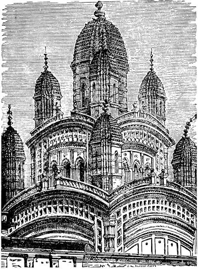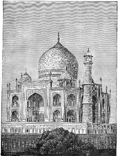 The jewel of India—the Koh-i-noor of its beauty—is the Taj, the tomb built by the Emperor Shah Jehan, the grandson of Akbar, for his wife, whom he loved with an[759] idolatrous affection, and on her death-bed promised to rear to her memory such a mausoleum as had never been erected before. To carry out his purpose, he gathered architects from all countries, who rivaled each other in the extravagance and costliness of their designs. The[760] result was a structure which cost fabulous sums of money (the whole empire being placed under contribution for it, as were the Jews for the Temple of Solomon), and employed 20,000 workmen for seventeen years. The building thus erected is one of the most famous in the world—like the Alhambra or St Peter’s—and of which enthusiastic travelers are apt to say that it is worth going around the world to see. This would almost discourage the attempt to describe it, but I will try and give some faint idea of its marvelous beauty.