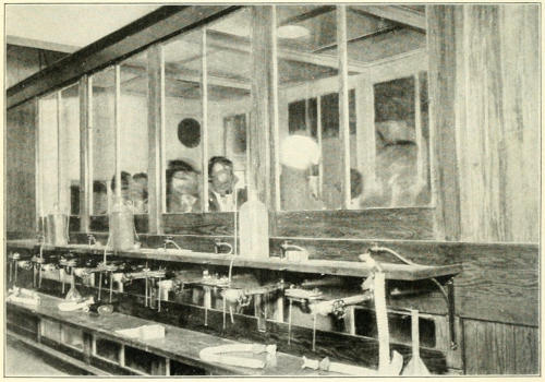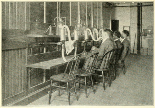 The Division of Tuberculosis is one of the four branches of the Division of Internal Medicine, it being the only division that has to do with a single disease. This is due to the fact that tuberculosis is admitted the world over to be the most prevalent disease known, one out of every seven of the earth’s inhabitants dying from some form of it. In order to detect the presence and combat the spread in the army of the Great White Plague, the Medical Corps very early in the war took steps to standardize the chest examinations of soldiers, all recruits being examined upon their arrival at the camps according to the standard thus devised by doctors who were specialists in tubercular troubles. These measures resulted in excluding from the army about 80,000 cases of active tuberculosis. Had the methods pursued in former wars been adhered to, a considerable proportion of these would undoubtedly have escaped detection, and, as tuberculosis is a highly communicable disease, thousands of perfectly healthy men would have become infected. Most of these tubercular cases would have had their disease aggravated by field service, and, moreover, the resources of the Medical Corps would have been heavily taxed had it been called upon to treat so large a number of patients. Soldiers who were suspected of having tuberculosis, or who developed [450]it while in the service, were examined by specialists, who confirmed or rejected the original diagnosis, those who were found to have the disease being immediately sent to special hospitals or sanatoria for treatment. The location of these sanatoria in such recognized and widely scattered health resorts as Asheville, North Carolina, Denver, Colorado, the Catskill Mountains, Arizona, and New Mexico enabled the medical authorities to send the soldier patients to regions which, as experience has taught, promote recovery from the disease, and which were at the same time as close as possible to their homes. Patients sent to these hospitals were not discharged from the service until they were cured or until the maximum improvement had been obtained. Thus soldiers received treatment which few civilians could afford, no multimillionaire being able to purchase better medical attention than that which Uncle Sam gave his boys. As tuberculosis is a chronic disease, and as a certain number of cases will relapse after its progress has apparently been arrested, special efforts were made to teach the patients how to live in order to prevent further retrogression, particular emphasis also being laid on the necessity of observing the sanitary precautions which will prevent the transmission of the tubercular germs from the patient to the members of his family.