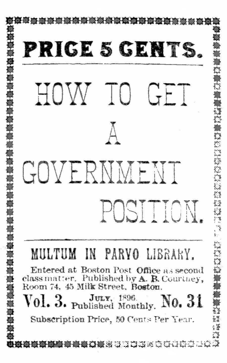 The Civil Service System of the United States has been extended until it is now the only avenue of entrance to thousands of lucrative positions. The examinations are competitive. Suppose that one hundred candidates write at a particular Civil Service examination in the city of Boston, that[3] sixty-five of these pass the examination and that there are forty vacancies to be filled. Of these sixty-five successful candidates, the forty who stand highest are chosen for the positions, the candidate, whether man or woman, standing first, taking the best position, the candidate standing second, taking the second best position, and so on down. This makes it very desirable and important that intending candidates spare neither time nor money in preparing themselves thoroughly for the examination.