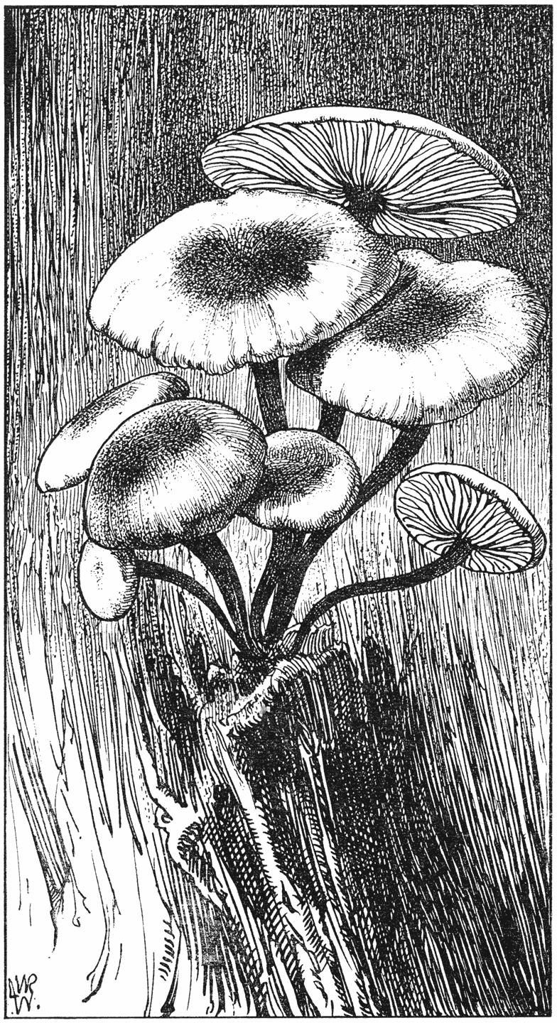 Ik heb bij dat paddestoelen zoeken dikwijls het gevoel, alsof ik een schatgraver ben. Niet, dat er iets mee te verdienen zou zijn, maar je vindt op onverwachte plaatsen soms de allermooiste dingen; fijne koraalzwammetjes, heerlijk naar anijs riekende blauwgroene paddestoeltjes (2) of zoo’n mooie, groote Inoloma (7) met hoog gewelfden, blauwen hoed, omzoomd met bruinen franjerand, even mooi als de kleurige Tricholoma (8).
