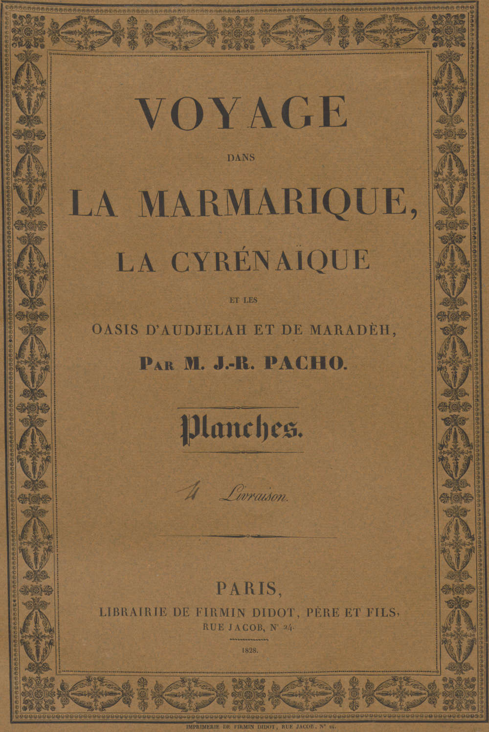 Jean-Raimond Pacho naquit à Nice le 23 janvier 1794, de Joseph Pacho, négociant riche et estimé, dont les ancêtres étaient d’origine suisse. Orphelin à huit ans, dans l’âge où l’on a besoin des soins maternels et de la vigilante tendresse d’un père, il fut placé au collége de Tournon, département de l’Ardêche. Là, son goût pour le dessin et la botanique se développa tout à coup, et n’eut d’autre rival que son penchant pour la poésie. C’était d’assez mauvaises dispositions pour l’aride étude des lois à laquelle on le destinait. Le cours de droit qu’il suivit à Aix, en 1812, ne fut pas terminé ; il l’abandonna, en 1814, pour retourner dans sa patrie, où il recueillit la part qui lui revenait dans l’héritage de ses parents. Maître d’une fortune toute mobilière à cette époque de la vie où le soin de l’avenir n’occupe guère, où le besoin de conserver est le dernier de ceux qu’on éprouve, M. Pacho alla voyager en Italie et séjourna quelque temps à Turin. Ce voyage n’enrichit que son esprit, n’accrut que ses connaissances, et n’augmenta que son enthousiasme[ii] pour les beaux-arts et les monuments de l’antiquité. Sa fortune en souffrit. Il vint à Paris, en juillet 1817, dans le dessein de l’améliorer. Il crut que la peinture pouvait le conduire à l’aisance, et le genre d’Isabey fut celui qu’il adopta. Il s’essayait dans l’imitation périlleuse d’un grand modèle, lorsque son frère négociant à Alexandrie l’appela près de lui. Il s’y rendit avec toutes les illusions de l’espérance ; elles se dissipèrent promptement ; et, après une année de séjour sans résultat, il revint à Paris reprendre ses pinceaux. Quelques portraits faiblement payés, quelques articles de journaux moins lucratifs encore, étaient loin de suffire à son existence. Il s’inquiétait de son avenir lorsque son frère l’engagea à se rendre une seconde fois en Égypte. Il arriva au Caire le 12 février 1822. Pendant les premiers mois de son séjour, il s’occupa à dessiner quelques-uns des monuments de cette grande cité et des environs. Il soumit ses essais à M. Jumel, alors directeur d’une des filatures de coton du Pacha, qui s’engagea à lui fournir les fonds nécessaires pour explorer la Basse-Égypte. Il la parcourut depuis le mois de décembre 1822 jusqu’en avril 1823, époque à laquelle une disgrace essuyée par M. Jumel lui enleva les moyens de soutenir cette entreprise scientifique. Sa mort, arrivée peu de mois après, renversa toutes les espérances de M. Pacho, et l’obligea à garder en portefeuille un grand nombre de dessins, plus ou moins curieux, de sites, de monuments et d’objets d’histoire naturelle. A côté de ces stériles richesses, il languissait inoccupé et sans appui dans la ville du Caire ; les soucis de l’inaction, si puissants sur les imaginations ardentes, altéraient sa santé ; l’épuisement de ses forces amenait le découragement ; il allait y succomber, lorsqu’il eut le bonheur de rencontrer dans M. Célestin Guyenet du canton de Neuchatel en Suisse, fondateur et directeur de la manufacture d’indiennes du vice-roi, un protecteur et un ami. M. Pacho en lui peignant sa position précaire, l’intéressa vivement à ses projets d’exploration ; il obtint de ce négociant, ami des sciences, les fonds nécessaires pour continuer ses recherches et entreprendre le voyage des cinq Oasis. Parti du Caire le 17 novembre 1823, il visita successivement le Fayoum, les Oasis de Syouah, el Arachièh, et Faredghah. Il regretta que les circonstances ne lui permissent pas d’explorer trois villages isolés à quatre journées nord-ouest de Faredghah, qu’on lui annonçait comme devant renfermer de nombreuses ruines d’anciens édifices. Il revint de Faredghah à Syouah, à l’Oasis du Fayoum, au temple Keroum, puis se dirigea sur Béni-Hassan et Siout, et se rendit à Béni-Ali où il resta treize jours pour obtenir d’Hamed Bey, l’ancien Kiahya du Caire, quelques Arabes destinés à lui servir de guides. Il visita avec eux la vallée Ruinée ou des ruines, l’Oasis d’El Karghèh, Gainah, Boulac, Dakakim, Berys et leurs environs. Il revint sur ses pas, puis se porta à l’ouest et atteignit l’Oasis de Dhakel, en passant par Aïn Amour, Ballat et Themida ; il examina l’Ouadi El Gharb, qui contient[iii] neuf villages, et le Bahr Be-la-ma qui traverse l’Oasis. Il reprit la route du nord, qui le conduisit à Farafrah, puis à Siout, d’où il revint au Caire dans le courant d’août 1824. Cette exploration des Oasis de l’Égypte, résultat de neuf mois de peines et de fatigues, ne satisfit point l’active curiosité de M. Pacho. Depuis long-temps un projet d’une tout autre importance occupait sa pensée. Pendant son premier voyage à l’Oasis d’Ammon, les Arabes Aoulad-Aly l’avaient souvent entretenu du Djebel-Akhdar, nom moderne de la Pentapole Cyrénaïque. Les descriptions qu’ils lui firent de leur ancien domaine, de ses vertes collines, de la fraîcheur de ses sources et des merveilles de ses ruines ravit son imagination, et fit naître chez lui le plus vif désir d’explorer cette terre riche de vieux souvenirs et presque inconnue. Il fit part de son projet à M. Henry Salt, consul général d’Angleterre, qui, tout en ne lui laissant ignorer aucun des dangers qui l’attendaient dans cette périlleuse excursion, lui remit le programme de la société de géographie, relatif à un voyage dans la Cyrénaïque. Ce programme, fruit de la proposition de M. Alex. Barbié du Bocage, éclairait une partie des recherches de M. Pacho, comme il le dit lui-même. Son influence sur sa détermination fut décisive. Il traçait déja son itinéraire, lorsqu’il découvrit une difficulté de nature à modérer un peu les élans d’un premier enthousiasme. Il s’aperçut que le voyage serait fort cher et qu’il était sans argent. Ses démarches, pour s’e