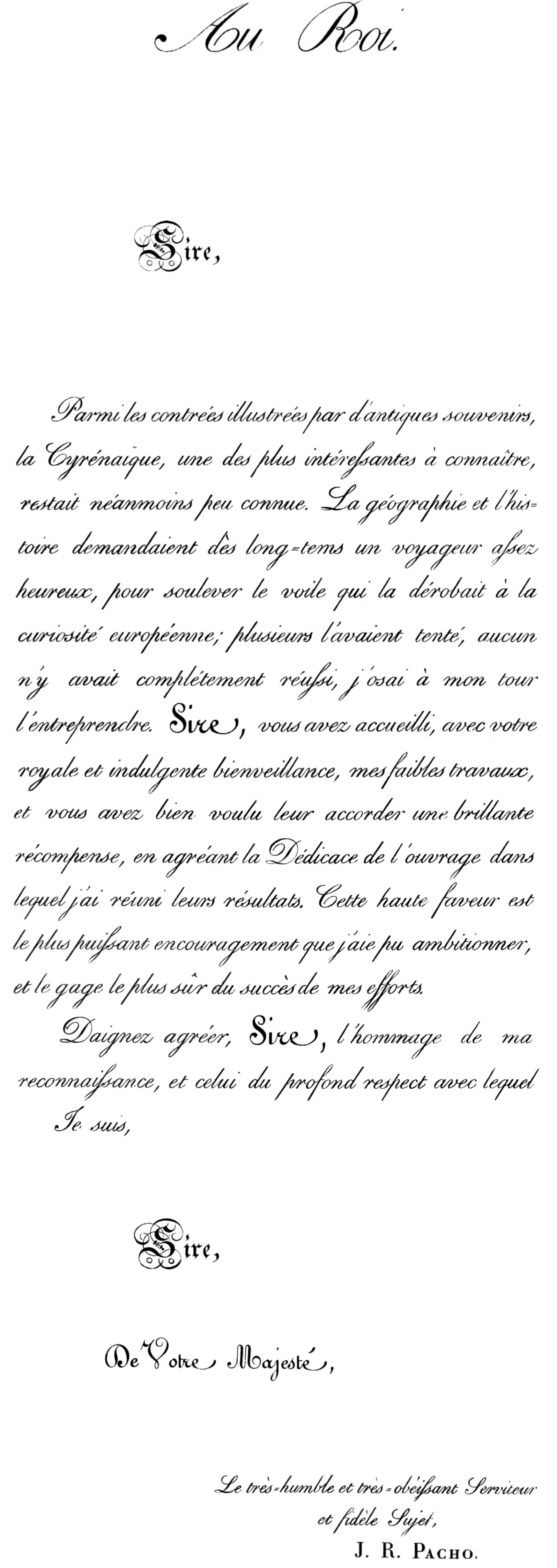 Parmi les contrées illustrées par d’antiques souvenirs, la Cyrénaïque, une des plus interessantes à connaître, restait néanmoins peu connue. La géographie et l’histoire demandaient dès long-tems un voyageur assez heureux, pour soulever le voile qui la dérobait à la curiosité européenne ; plusieurs l’avaient tenté, aucun n’y avait complétement réussi, j’osai à mon tour l’entreprendre. Sire, vous avez accueilli, avec votre royale et indulgente bienveillance, mes faibles travaux, et vous avez bien voulu leur accorder une brillante récompense, en agréant la Dédicace de l’ouvrage dans lequel j’ai réuni leurs résultats. Cette haute faveur est le plus puissant encouragement que j’aie pu ambitionner, et le gage le plus sûr du succès de mes efforts.