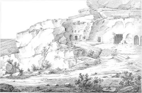 | LXXXVIII. | VUE D’UNE GROTTE SÉPULCRALE, APPARTENANT AU MOYEN ÂGE, ET FAISANT PARTIE DE LA NÉCROPOLIS DE CYRÈNE. |