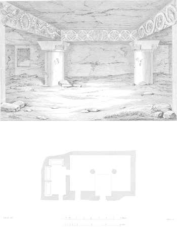 | LV. | INTÉRIEUR D’UNE GROTTE SÉPULCRALE CHRÉTIENNE : NÉCROPOLIS DE CYRÈNE. |
